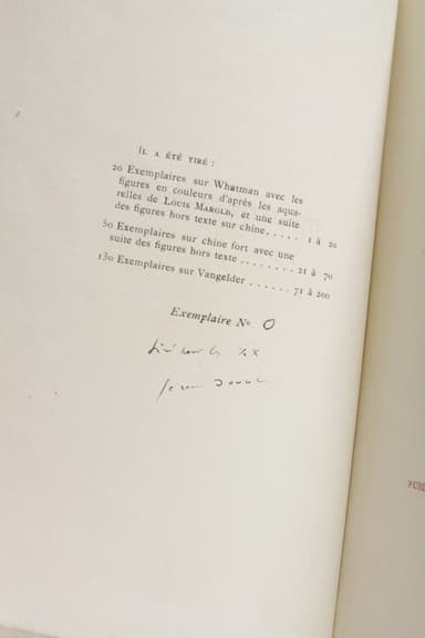 Edition originale, un des 130 exemplaires numérotés sur Hollande, le nôtre un des hors commerce portant le N°0 et réservés à la société bibliophilique des "XX". Envoi autographe signé de Jérome Doucet pour la société bibliophilique des "XX". Ouvrage orné de 10 illustrations de Louis Marold. Les fragiles couvertures parcheminées comportent des piqûres, agréable état intérieur.