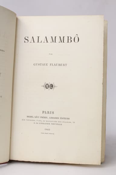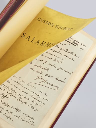 Notre exemplaire est enrichi d'une lettre autographe signée de Gustave Flaubert adressée à l'archéologue Charles-Ernest Beulé, concernant ses recherches préalables à l'écriture de Salammbô. Deux pages rédigées à l'encre noire sur un feuillet remplié monté sur onglet. Le destinataire de cette lettre a apposé neuf lignes manuscrites, brouillon de sa future réponse, à la suite de la lettre de Flaubert.