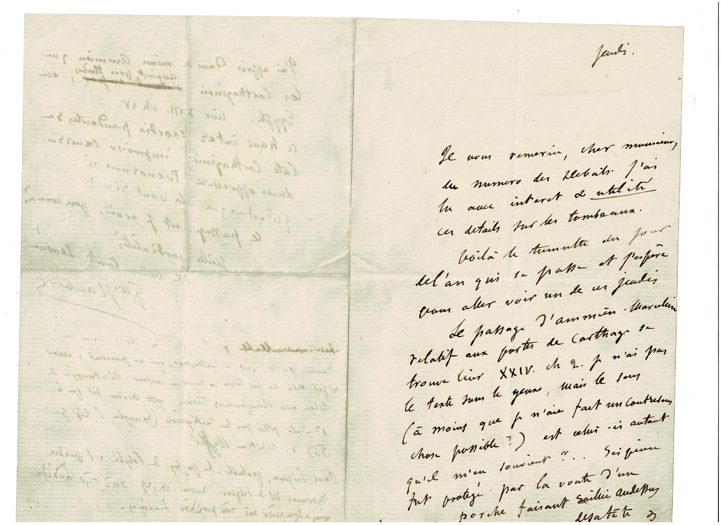 Il entame alors un travail de fourmi, appuyant ses recherches sur les textes des grands historiens de l'Antiquité qu'il lit en latin dans le texte. La lettre que nous proposons en montre d'ailleurs sa grande maîtrise : « J'ai appris, dans ce même Ammien que les Carthaginois ont pris Thèbes, en Egypte, livr[e] xvii, ch. iv. "Hanc inter exordia pandentis se late Carthaginis, improviso excursu duces oppressere Poenorum" ["À l'époque où Carthage commençait sa large expansion, les généraux des Phéniciens vainquirent celle-ci par une attaque à l'improviste"]. »