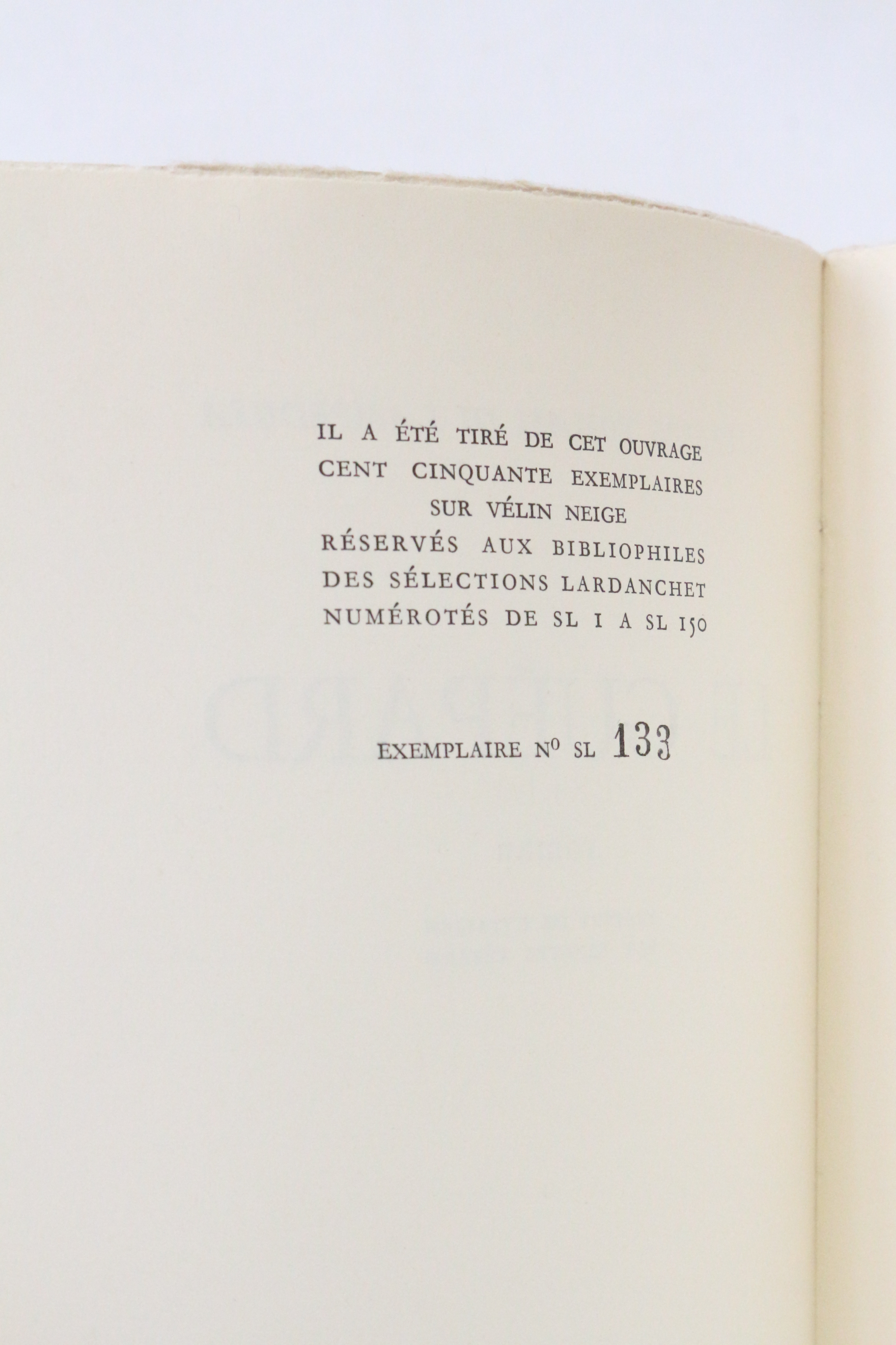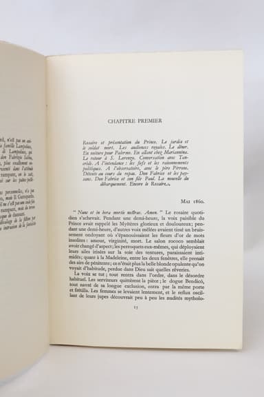 Edition originale de la traduction française, un des 150 exemplaires numérotés sur vélin neige réservés aux bibliophiles des Sélections Lardanchet, seuls grands papiers. Infimes piqûres sans gravité sur le dos. Rare et agréable exemplaire de ce chef d'oeuvre magistralement adapté au cinéma par Luchino Visconti, (Palme d'or à Cannes en 1963), avec pour acteurs principaux Claudia Cardinale, Burt Lancaster et Alain Delon. Rare.