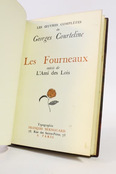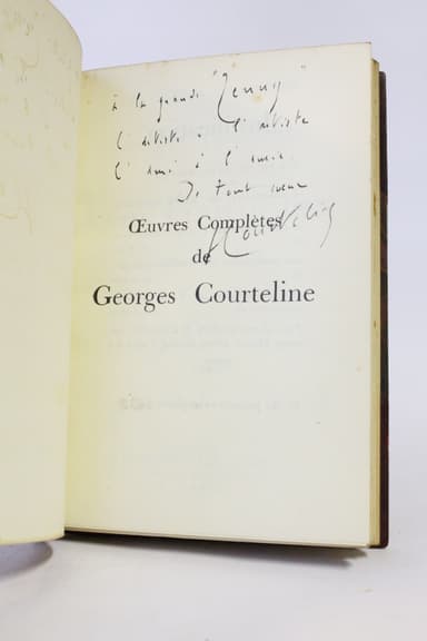Nouvelle édition parue dans les oeuvres complètes de l'auteur, un des 1240 exemplaires numérotés sur vergé de Navarre. Reliure en demi maroquin bordeaux à coins, dos à quatre nerfs sertis de pointillés dorés orné de quintuples caissons dorés, plats de papier marbré, gardes et contreplats de papier à la cuve, ex-libris encollé sur un contreplat, couvertures et dos conservés, tête dorée, reliure de l'époque signée de Kauffmann & Horclais. Envoi autographe signé de Georges Courteline : "A la grande "Jenny" (Sacerdote), l'artiste à l'artiste, l'ami à l'ami. De tout coeur." Quelques rousseurs affectant principalement la première garde et quelques marges de certains feuillets. Exemplaire joliment établi.
