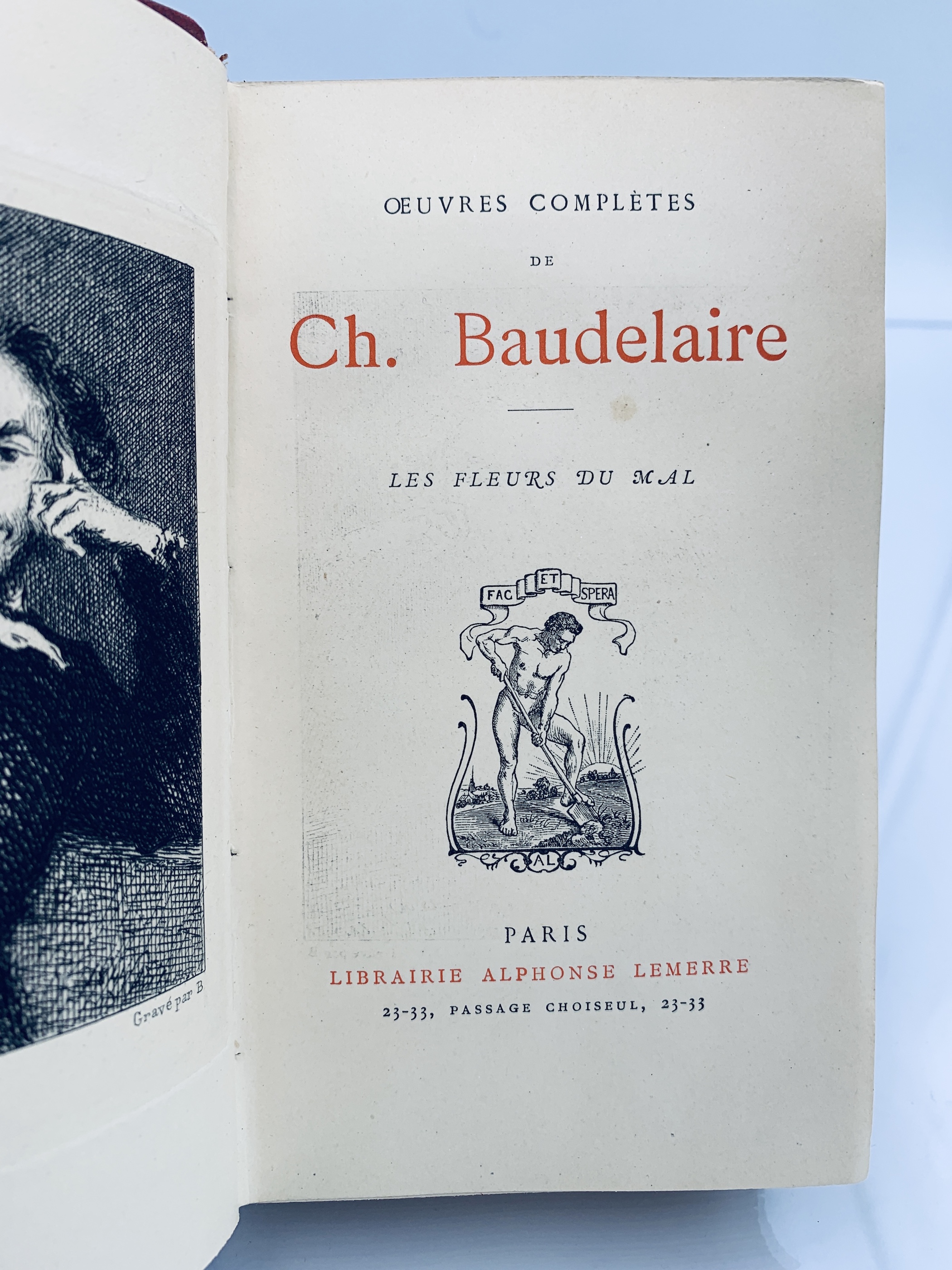 Nouvelle édition et première édition chez Lemerre des oeuvres de Baudelaire. Les traductions de Poe en 3 volumes parurent en 1892 et ne font pas partie de cet ensemble. Pages de titre en rouge et noir. impression sur vélin teinté. Portrait gravé en frontispice d'après Emile Le Roy par Braquemont. Reliure en demi basane vieux rouge d'époque. Dos à nerfs orné. Titres dorés. Tête dorée. Couvertures conservées. Légères traces de frottement. Ensemble parfaitement frais. Bon exemplaire.
