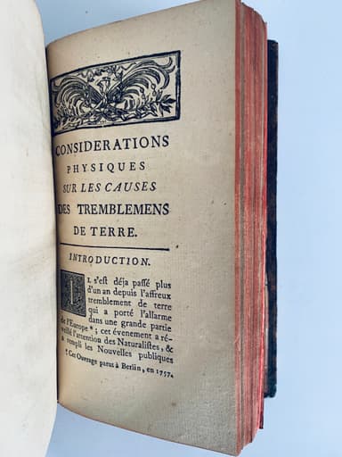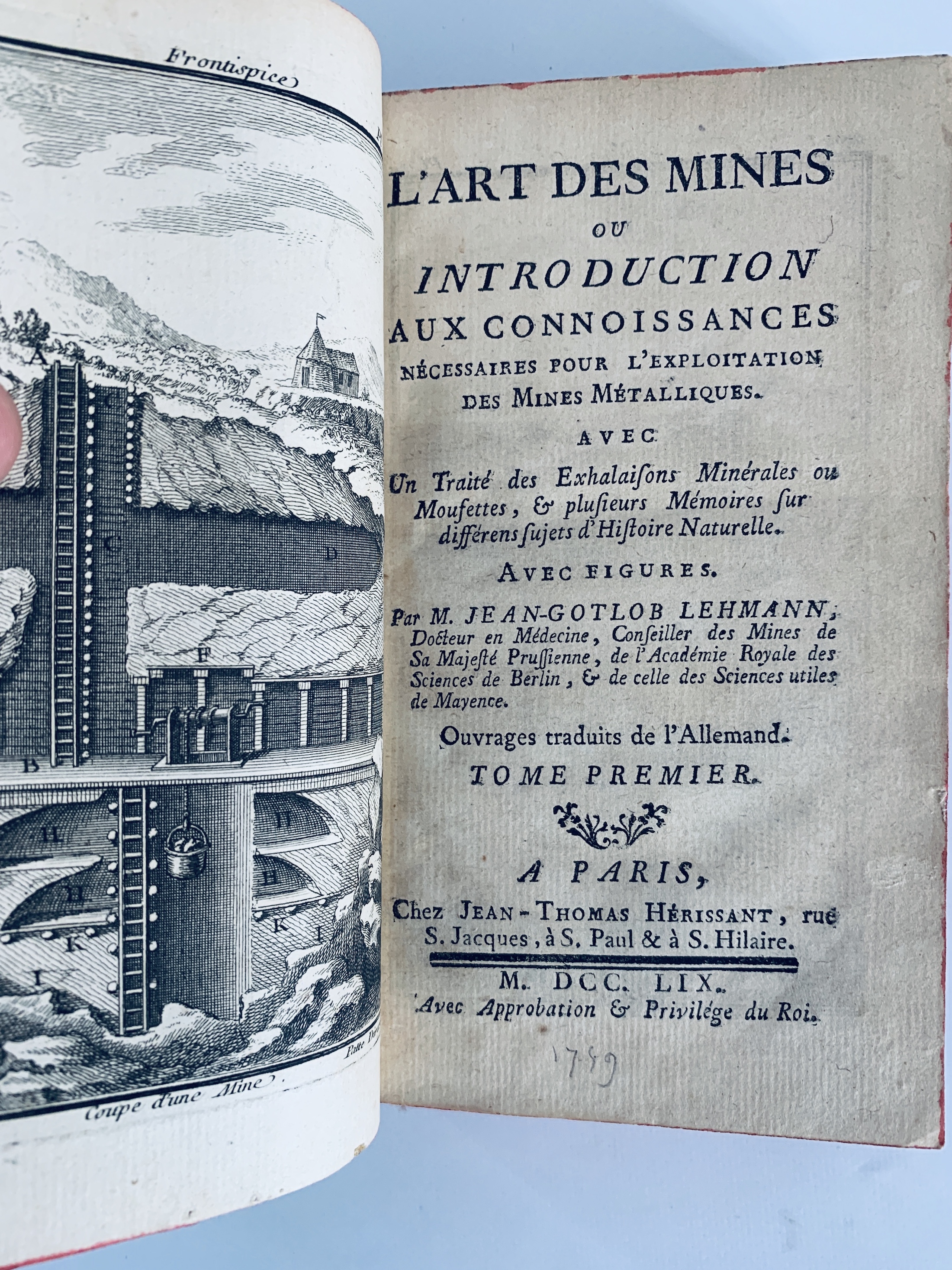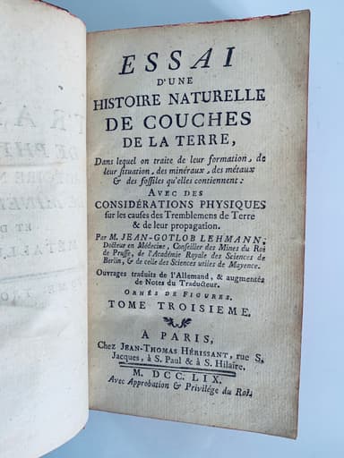 Edition originale, rare, et illustrée de 4 figures dans le premier volume et 6 dont 5 dépliantes dans le troisième tome. Traduit de l'Allemand avec des notes du traducteur. Faux-titre commun aux 3 volumes : Traités de physique, d'histoire naturelle, de minéralogie et de métallurgie. Reliure en pleine basane brune granitée d'époque. Dos à nerfs orné. Pièces de titre en maroquin rouge, tomaisons dorées en queue. Traces de frottement, notamment aux mors. Légers accidents au mors inférieur du tome 3 en queue, étroite fente au mors supérieur en tête du tome 1 sur 0,5cm. Rousseurs très pâles éparses. Bel exemplaire. Considéré comme le père de la géologie moderne et le fondateur de la stratigraphie (étude des strates de la terre), Lehmann (1719-1767) fut un minéralogiste et un géologue réputé pour ses travaux. Dès 1750, son essai sur la formation des métaux lui permit d'être missionné par l'Académie des sciences de Prusse pour une étude des mines sur l'ensemble de la Prusse. Lehmann en tira son ouvrage de L'art des mines, dont de nombreux termes sont entrés dans la littérature de la géologie. En 1767, il fut invité par l'Académie impériale des sciences de Russie où ildevint professeur de chimie et Directeur du musée impérial des sciences. Il est démeuré célèbre pour sa description précise des différentes couches de roches stratifiées de la terre.