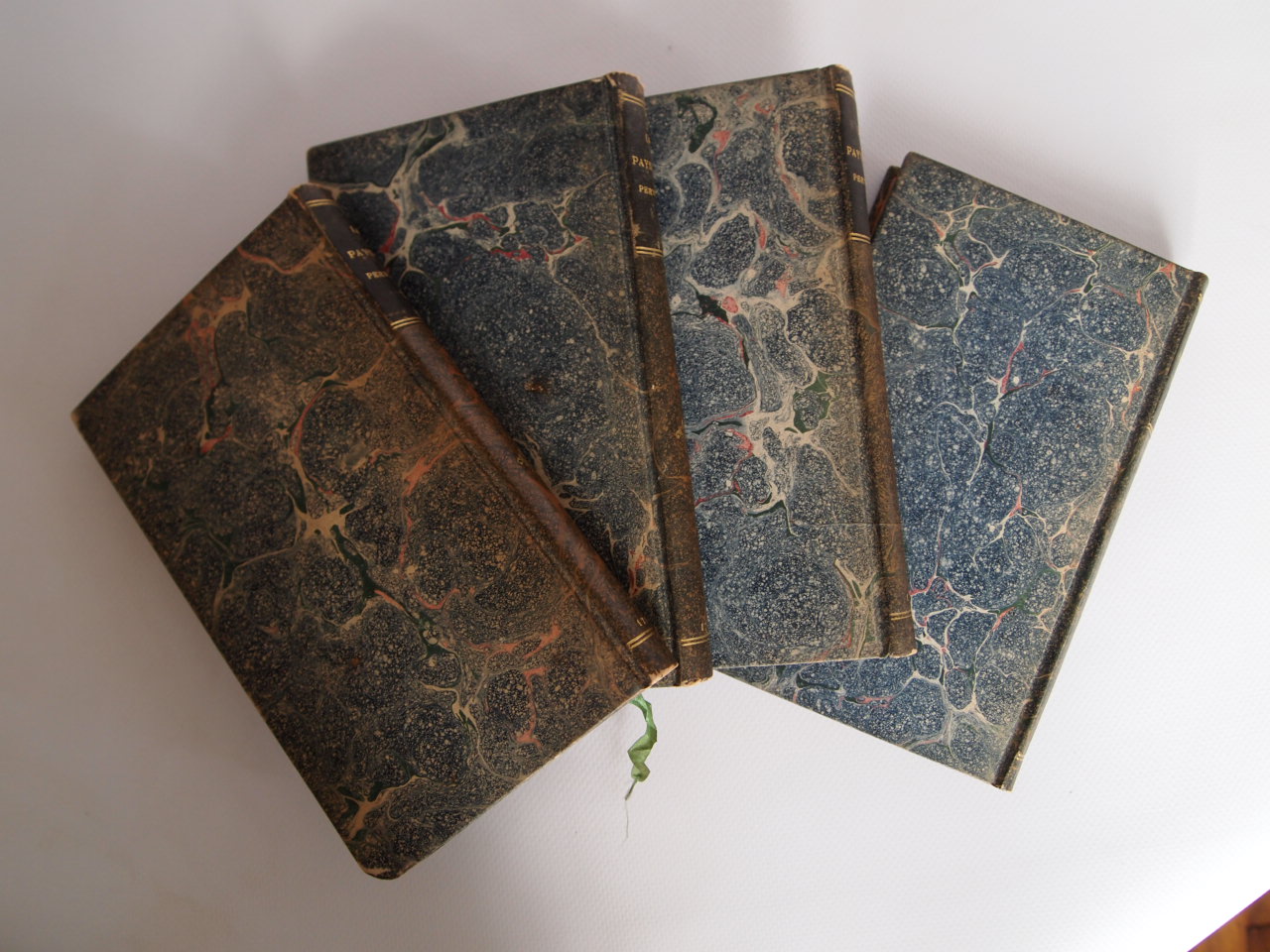 Reliures en cartonnage à la bradel fin XIXe. Papier marbré bleu. Pièces de titre de maroquin bordeaux. Dos brunis. Exemplaire non rognés, relié sur brochure. Petits manques en tête du tome 2.