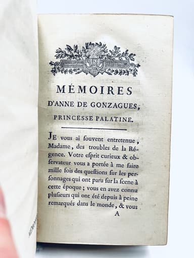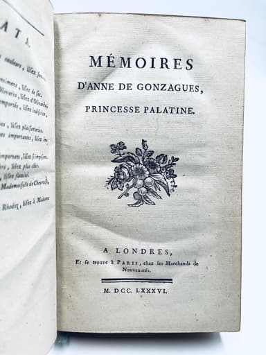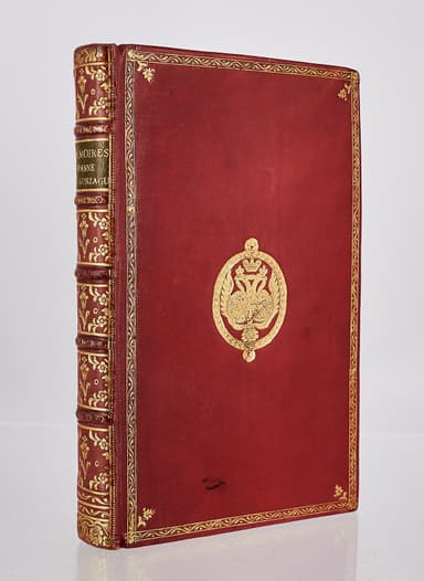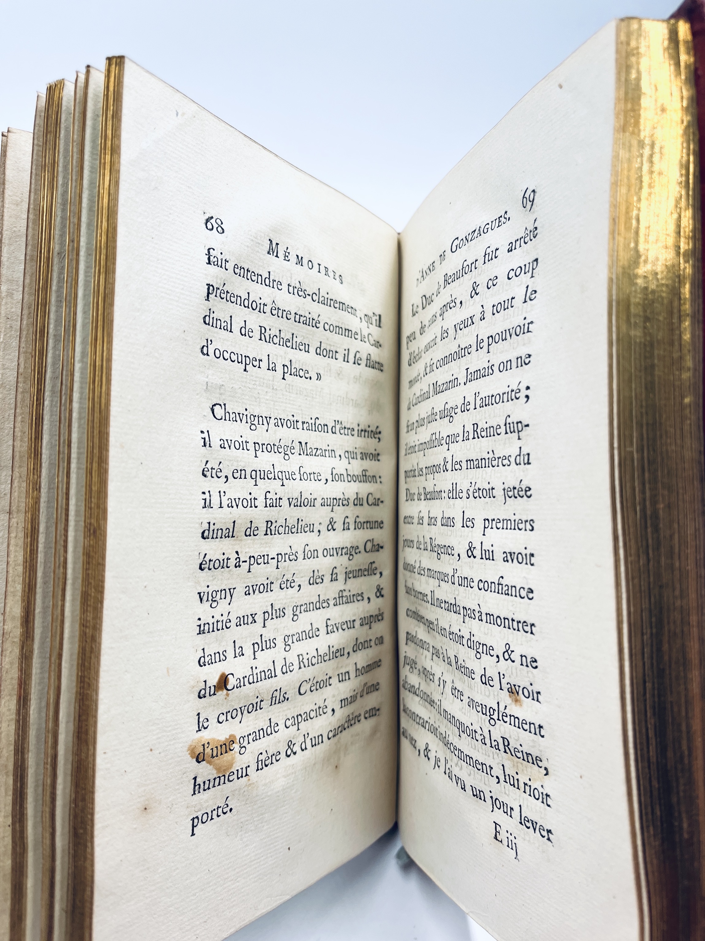 Superbe exemplaire d'une illustre provenance, renfermant les mémoires de la princesse Anne de Gonzague de Clèves importante figure de la Fronde, initialement destinée à la vie monastique, et dont la vie rocambolesque fut rythmée par les amours secrètes, le travestissement, la conspiration et la tenue d'un important salon littéraire.