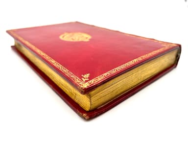 Reliure aux armes de Maria Feodorovna, impératrice de Russie, née Princesse Sophie-Charlotte de Wurtemberg-Montbéliard (1759-1828), mère des Tsars Alexandre 1er et Nicolas 1er, et épouse de Paul 1er. Aigle à deux têtes soutenant à droite l'emblème de l'Empire russe et à gauche celui du Wurtemberg, encadré du ruban de l'ordre de Sainte Catherine.
