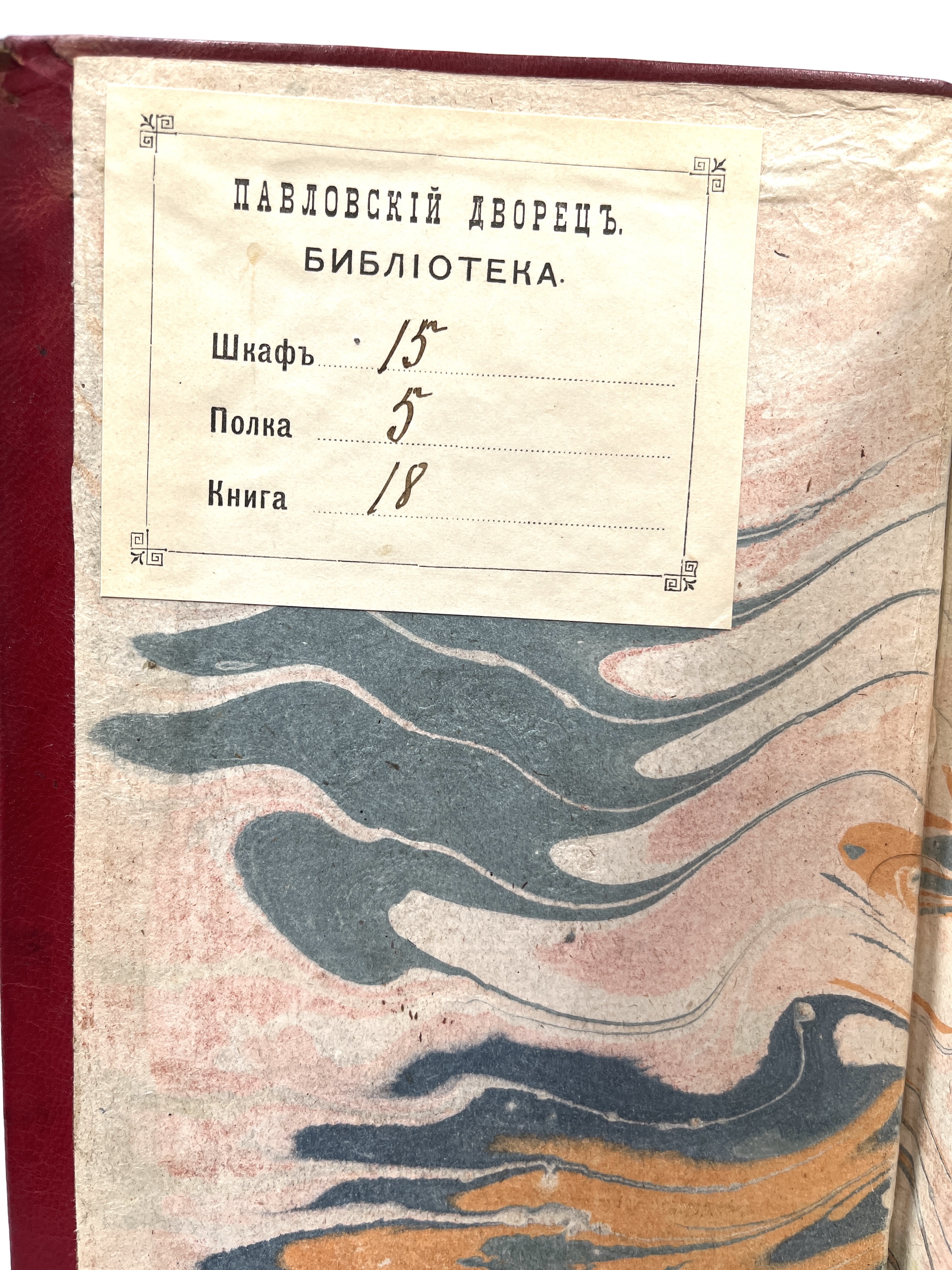 Provenance : de la bibliothèque du Palais de Pavlovsk avec son étiquette de rangement apposée au premier contreplat.