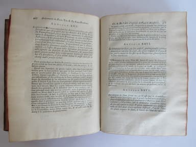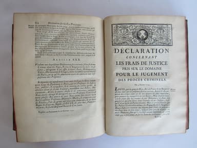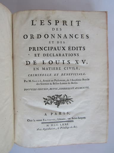 Nouvelle édition. Reliure en en pleine basane brune granitée et glacée. Dos à nerfs orné. Pièce de titre en maroquin rouge. Coiffe de tête en partie élimée. Mors supérieur fendu en queue. Frottements. Trace de mouillure pâle au coin droit de la page de titre allant s'estompant. Feuillet 657 replié par 2 fois. Bon exemplaire. Le recueil contient les ordonnances suivantes : donations, testaments, substitutions, faux, successions, billets ou promesses, baptêmes, mariages, sépultures, etc., procédures criminelles, rapt de séduction, cas prévotaux et présidiaux, frais de justice, droit d'indemnité dû par les ecclésiastiques, degrés, résignations, établissements et acquisitions des gens de main-morte, donations dans les contrats de mariage.