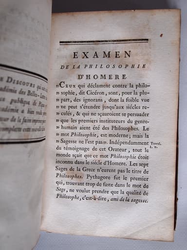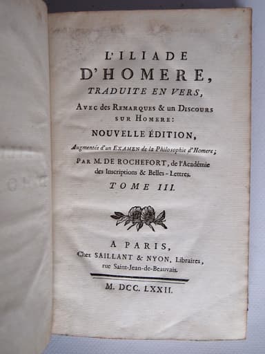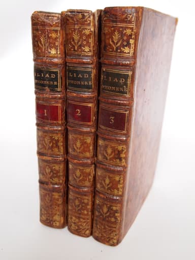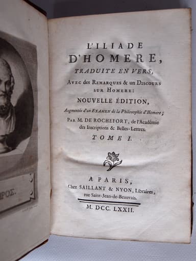Seconde édition après l'originale de 1765, augmentée d'un volume, et illustrée d'un portrait d'Homère de Préaudeau de Chemilly gravé par A. de St. Aubin et de 25 figures par Biosse en médaillon, dans des encadrements. Edition augmentée de L'examen de la philosophie d'Homere par Rochefort. Reliures en pleine basane brune marbrée d'époque. Dos à nerfs ornés. Pièces de titre en maroquin noir, et de tomaison en maroquin rouge. Coiffes de tête arrachées aux tomes 1 et 2. Mors ouverts en tête au tome 2. Mors inférieur ou vert en tête au tome 3. Quelques piqûres, notamment en marge des planches. Des manques aux mors. Nouvelle traduction en vers qui rend très français le texte d'Homère en le faisant lorgner du côté de Racine. Cette édition est intéressante pour ses nombreuses notes en bas des pages, pour le discours sur Homere et cet Examen de la philosophie d'Homere. Guillaume Dubois de Rochefort fut un helleniste français dont on rechercha les commentaires sur les oeuvres grecques mais qui fut assez critiqué pour ses traduction froides et manquant de sensibilité.