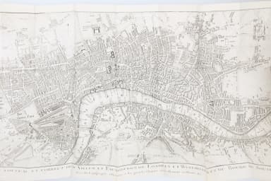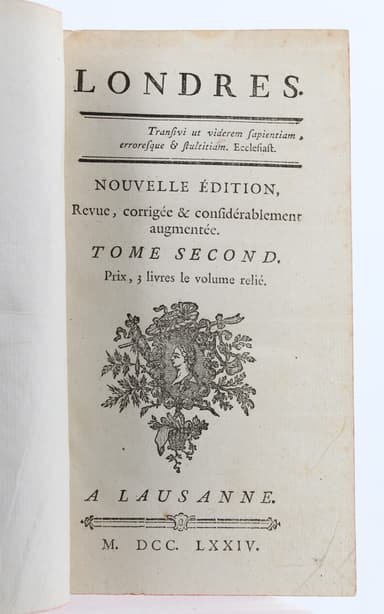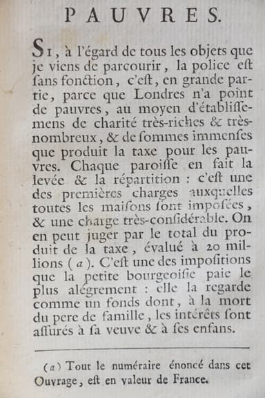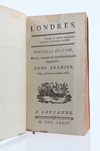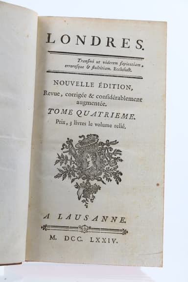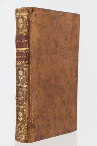 Seconde édition en partie originale, après l'édition originale de 1770, qui contenait seulement 3 volumes. Une grande carte dépliante dans le tome I de Londres et des villes et faubourg de Londres et de Westminster. Reliures en plein veau glacé marbré d'époque. Dos lisse orné. Pièces de titre en maroquin rouge. Quelques épidermures et accrocs avec manques, mais bon ensemble, décoratif. Relation de voyage, qui part de Boulogne et se poursuit jusqu'à Londres dont il est fait une étude détaillée des moeurs, des coutumes et de tous les aspects de la société : les pauvres, la jurisprudence, le clergé, les arts, la marine, les courses de chevaux, le commerce 371pp. (... et des chapitres particuliers sur la mélancolie, considérée comme une caratéristique des anglais, et en quoi celle-ci a contribué à leur génie dans les arts ou les sciences.