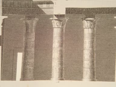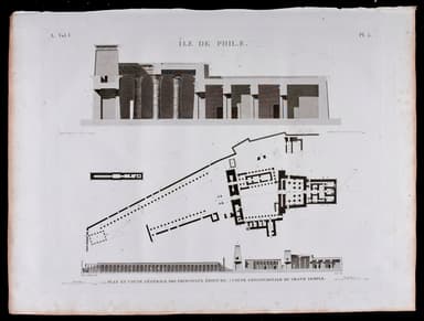 La Description de l'Egypte est un des chefs d'œuvre de l'édition française et le point de départ d'une nouvelle science : l'égyptologie. Titanesque exposé de l'Egypte au temps des conquêtes de Bonaparte entre 1798 et 1799, elle est répartie en 23 volumes dont 13 volumes de gravures rassemblant près de 1000 planches en noir et 72 en couleur. Les 6 volumes de planches intitulées Antiquités sont consacrés aux splendeurs de l'Egypte pharaonique. L'Histoire naturelle est répartie en 3 volumes de gravures. Un volume est consacré aux Cartes géographiques et topographiques tandis que les 3 volumes : Etat Moderne dressent un portrait saisissant de l'Egypte copte et islamique telle qu'elle était vue par les armées d'Orient de Bonaparte.