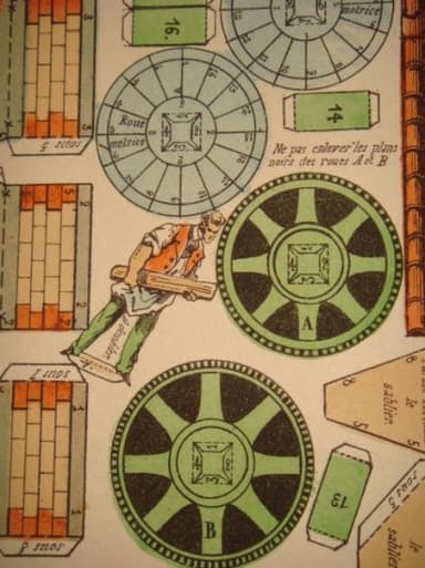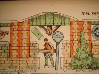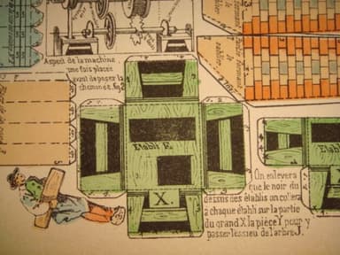 Ces planches sont des constructions ou maquettes en carton, sur lesquelles un patron était imprimé. Ce patron doit être découpé puis assemblé pour construire divers objets ou scènes de vie.