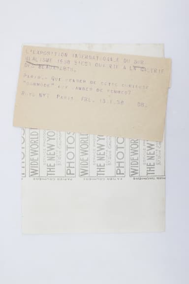 Papillon ronéotypé encollé au dos du cliché : « L'exposition internationale du surréalisme 1938 s'est ouverte à la galerie des Beaux-arts. Paris. Que penser de cette curieuse « commode » aux jambes de femme ? Photo NYT Paris Fre. 18.1.38 DB »