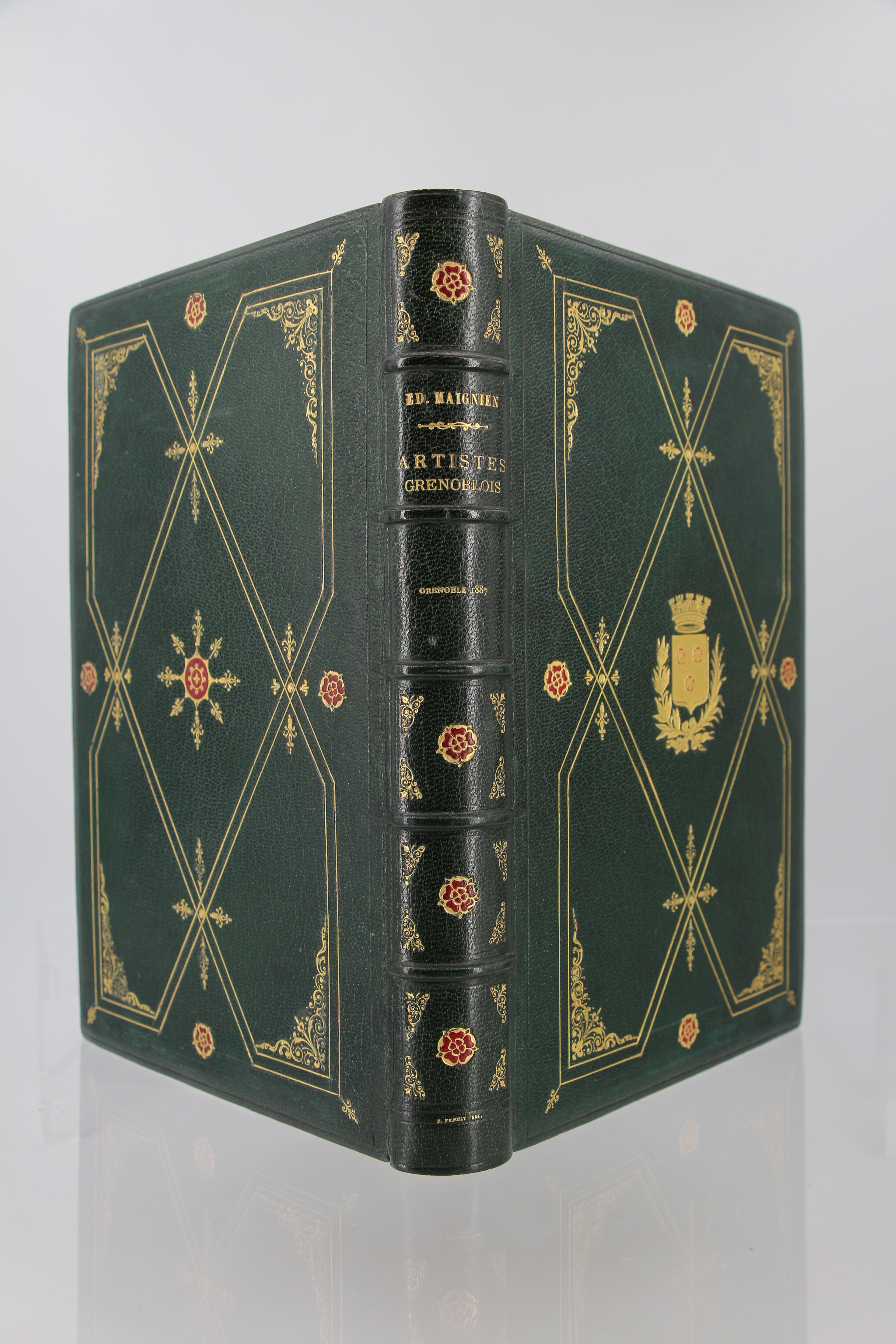 Edition originale imprimée à 200 exemplaires, le nôtre un des 10 sur hollande justifiés par Edmond Maignien. Reliure en plein maroquin vert, dos à cinq nerfs ornés de caissons noirs décorés de motifs typographiques dorés et de pièces de maroquin mosaïqué rouge représentant les roses des armoiries de la ville de Grenoble, roulettes dorées sur les coiffes, premier plat frappé en son centre des armoiries de la ville de Grenoble, plats décorés d'entrelacs dorés et de pièces de maroquin mosaïqué rouge représentant les roses des armoiries de la ville de Grenoble, gardes et contreplats de papier dorée, encadrement d'une dentelle dorée sur les contreplats, couvertures conservées, tête dorée, filets dorés sur les coupes, magnifique reliure frappée aux armes de la ville de Grenoble signée E. Frauly, relieur grenoblois, étui en plein papier marbré, intérieur de papier peigné. Très bel exemplaire parfaitement établi.
