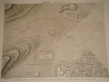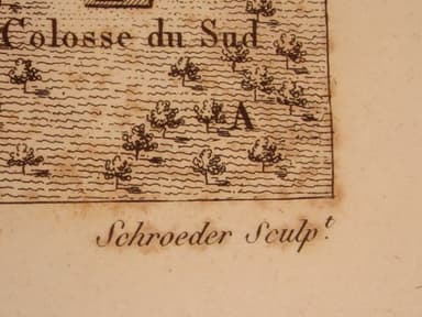Parallèlement, les savants effectuent des relevés et des vues extrêmement détaillées des colosses dits « de Memnon », seuls restes de l'immense temple mémorial d'Amenhotep III construit sur la route menant à la nécropole de la vallée des Rois. Ils étaient placés à l'entrée du temple, devant un premier pylône construit en briques. Ces deux statues représentent le roi Amenhotep III, encadré à droite de la grande épouse royale Tiyi et à gauche de la reine mère Moutemouia.