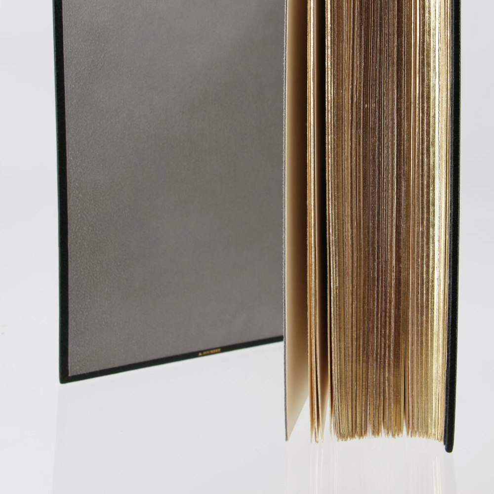 Reliure en plein maroquin janséniste vert sapin, dos lisse très légèrement assombri sans gravité, gardes et contreplats de daim gris souris, couvertures et dos conservés, toutes tranches dorées, étui bordé de maroquin vert sapin, plats de papier façon bois, intérieur de papier gris souris, superbe reliure en plein maroquin signée A. Bourdet.