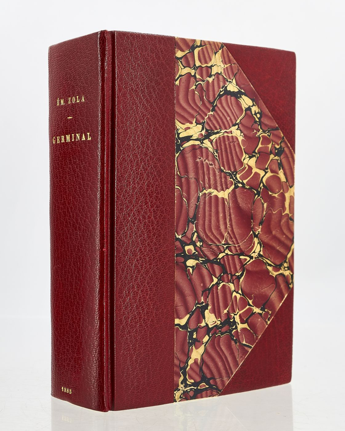 Reliure à la bradel en demi maroquin rouge à coins, dos lisse, date dorée en queue, plats de papier marbré, gardes et contreplats de papier peigné, couvertures et dos conservés, reliure début XXe signée Alfred Farez.