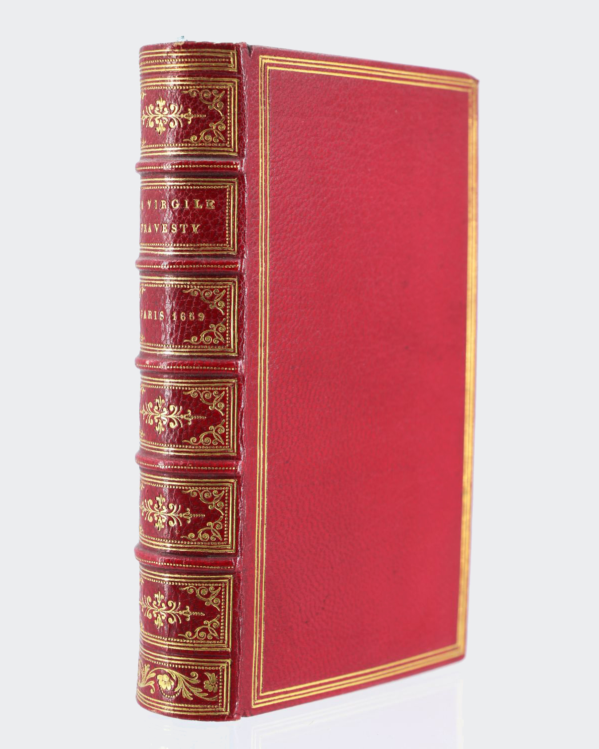 Reliures en plein veau glacé havane, dos légèrement éclaircis à cinq nerfs sertis de filets dorés et ornés de motifs typographiques dorés, pièces de titre et de tomaison de veau bleu marine, mors du premier volume fragiles, roulettes dorées sur les coiffes, encadrement de triples filets dorés sur les plats, gardes et contreplats de papier à la cuve, encadrement de triples filets dorés sur les contreplats, filets dorés sur les coupes, coins légèrement émoussés, reliures romantiques de l'époque signées de Bauzonnet.