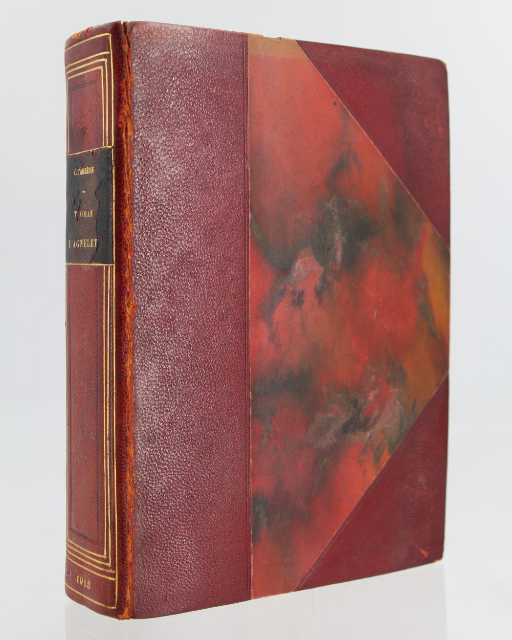Reliure en demi chagrin rouge à coins, dos lisse orné de quintuples cartouches dorés et à froid, date en queue, mors frottés, plats de papier marbré, gardes et contreplats de papier à la cuve, couvertures et dos conservés, tête dorée sur témoins, reliure de l'époque signée à froid de Azaris.