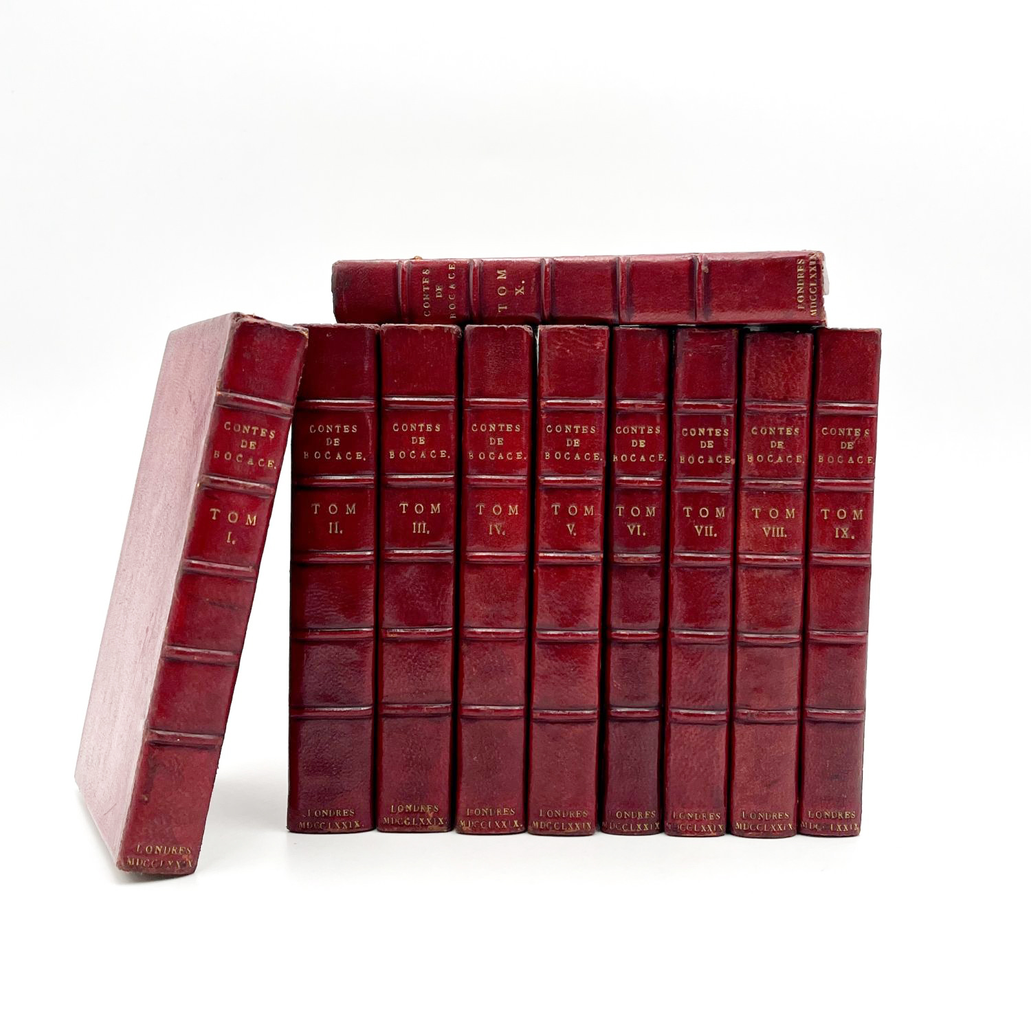 Reliure anglaise en plein maroquin à petits grains vieux rouge glacé ca 1850 signée B. M. Bromace sur chaque dernier feuillet. Dos à nerfs janséniste. Titre, tomaison, date et lieu sur 3 caissons. Traces de frottement. 2 coins un peu émoussés. Quelques pâles rousseurs sur un ensemble frais. Petits fragments manquant en tête des volumes I et X.