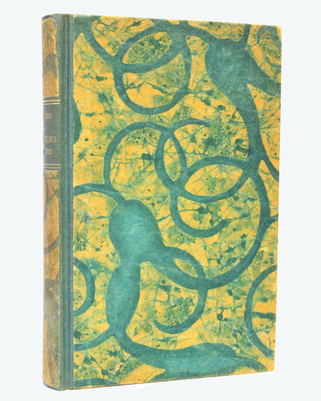 Reliure à la bradel en plein papier à motifs abstraits, dos lisse légèrement décoloré, pièce de titre de toile verte, gardes et contreplats de papier à la cuve, tranches mouchetées, reliure de l'époque signé de Barast.