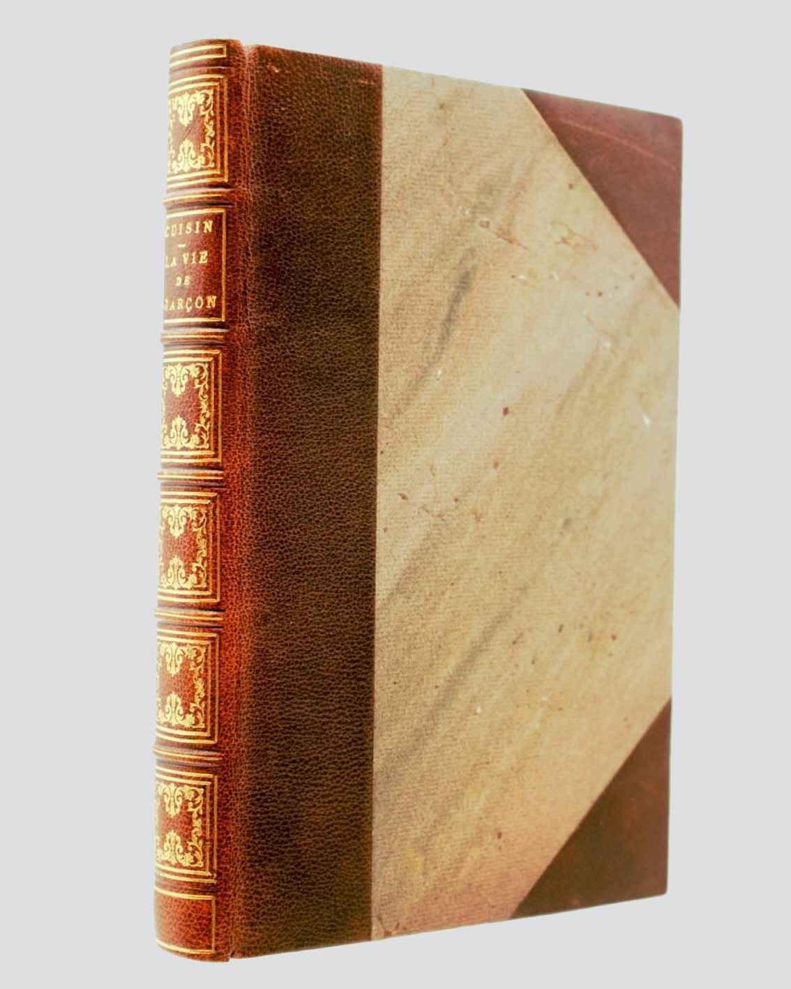 Reliure en demi chagrin maroquiné marron à coins, dos légèrement éclairci à cinq nerfs sertis de filets dorés et orné de doubles caissons dorés et décorés, plats de papier marbré, gardes et contreplats de papier à la cuve, couvertures et dos conservés, tête dorée, reliure signée Barbance successeur d'Yseux-Simier.
