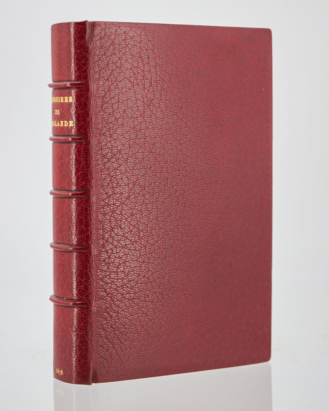 Reliure en demi maroquin bleu marine à coins, dos à quatre nerfs, date dorée en queue, plats, gardes et contreplats de papier caillouté, filets dorés en encadrement des plats, couvertures et dos conservés, tête dorée, reliure de l'époque signée Bellevallée.