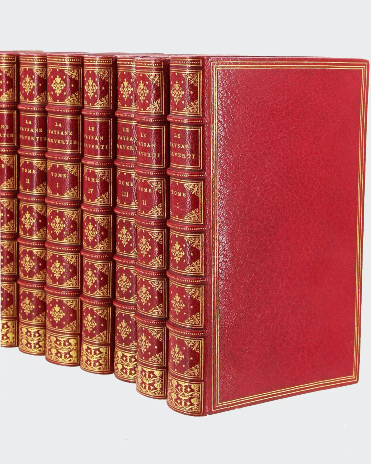Reliure en demi maroquin bleu nuit à coins un peu postérieur signée Belz-Niedrée en haut de la première page de garde. Dos à nerfs très richement orné de fers composés de multiples rinceaux et entrelacs. Double filet de séparation sur les plats et coins. Tête dorée. papier légèrement bruni (avec quelques feuillets plus bruns), rousseurs éparses. Exemplaire à toutes marges, les hors-texte souvent un peu plus courts. Traces de frottement.