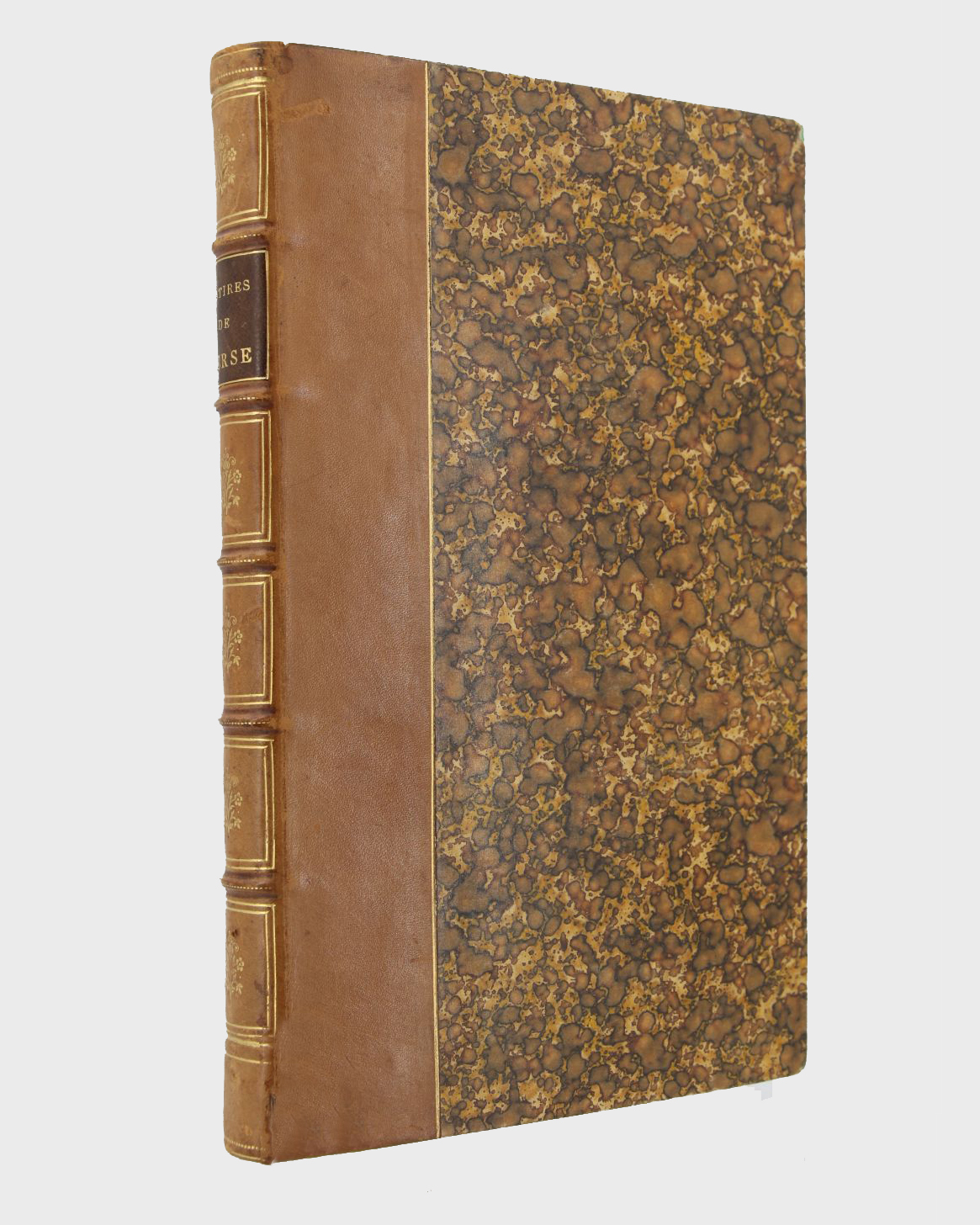 Reliure en demi basane havane, dos à cinq nerfs sertis de pointillés dorés orné de doubles caissons dorés agrémentés de motifs floraux dorés, un mors fendu en pied avec manque, filet doré sur les plats de papier marbré, gardes et contreplats de papier à la cuve, ex-libris armorié encollé au verso du premier plat, reliure signée de Bernon.