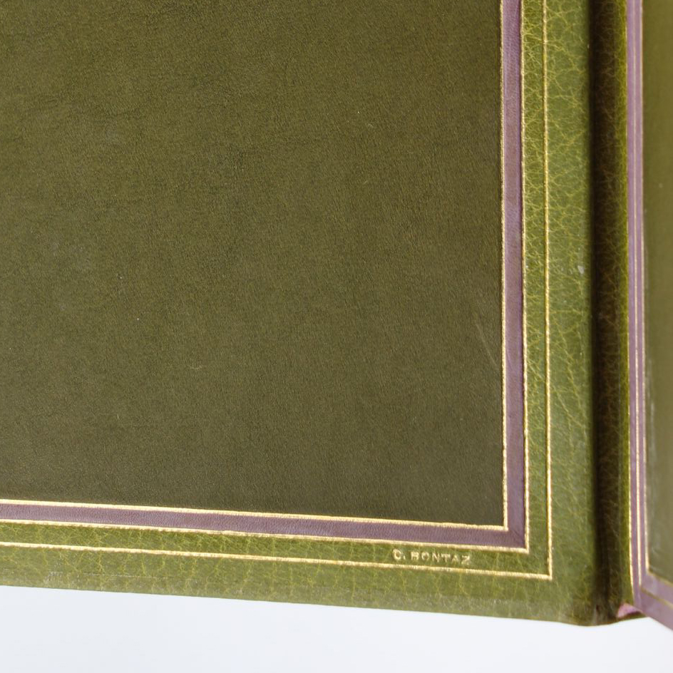 Reliure en plein maroquin vert pistache, dos à cinq nerfs, date dorée en queue, gardes et contreplats de box kaki, encadrement de triples filets dorés et d'un listel de box mauve sur les contreplats et les gardes, gardes suivantes de papier marbré, couvertures et dos conservés, tête dorée, étui bordé de maroquin vert pistache, plats de papier marbré, intérieur de papier mauve, ensemble signé Bontaz.