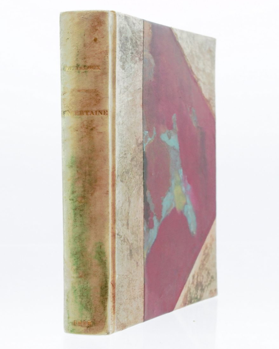 Reliure à la bradel en demi maroquin citron à coins, dos lisse passé orné d'un élément décoratif mosaïqué de maroquin vert, rouge, orange et brun représentant une grappe de fruits et des feuilles, date en queue, plats de papier marbré, gardes et contreplats de papier marbré, couvertures et dos conservés, reliure de l'époque signée à froid de Brisson.