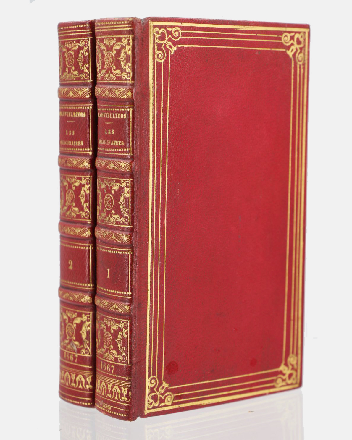 Reliures début XIXème en plein maroquin rouge, signées Canon. Dos à quatre nerfs richement ornés de caissons, fleurons, dentelles et roulettes dorées. Plats encadrés de quadruples filets dorés et d'arabesques dorées en écoinçons. Fines dentelles dorées en encadrement des contreplats. Toutes tranches dorées. Très bel exemplaire.