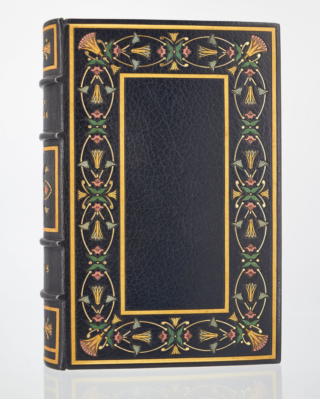 Reliure en demi maroquin rouge à coins, dos lisse orné de triples cartouches dorés se terminant en entrelacs agrémentés de pièces de maroquin mosaïqué vert, date dorée en queue, encadrement de filets dorés sur les plats de papier marbré, gardes et contreplats de papier marbré, tête dorée, couvertures et dos conservés, élégante reliure de l'époque signée Charles Lanoë.