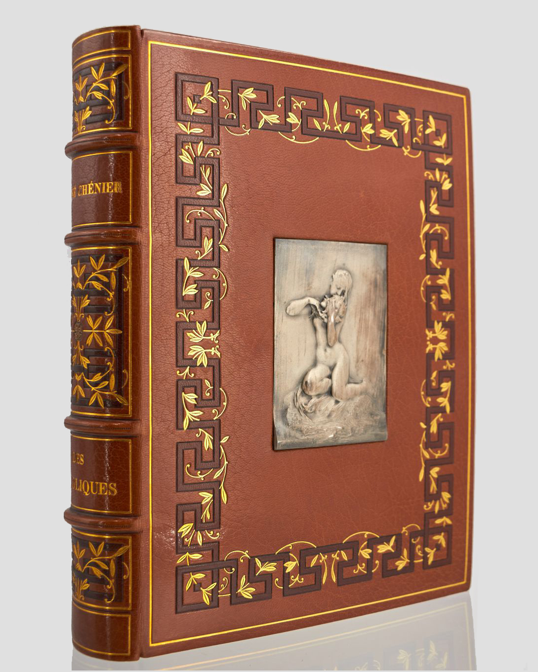 Reliure à la Bradel en demi maroquin vert tendre mosaïqué à coins signée Charles Meunier en haut de la première page de garde. Dos lisse orné d'un iris sur tige avec ses boutons (fleurs et boutons mosaïqués d'orange et brun). Filets de séparation sur les plats. Dos ayant viré au brun uniformément. Un coin émoussé. Traces de frottement aux coins et bordures. Très bel exemplaire.