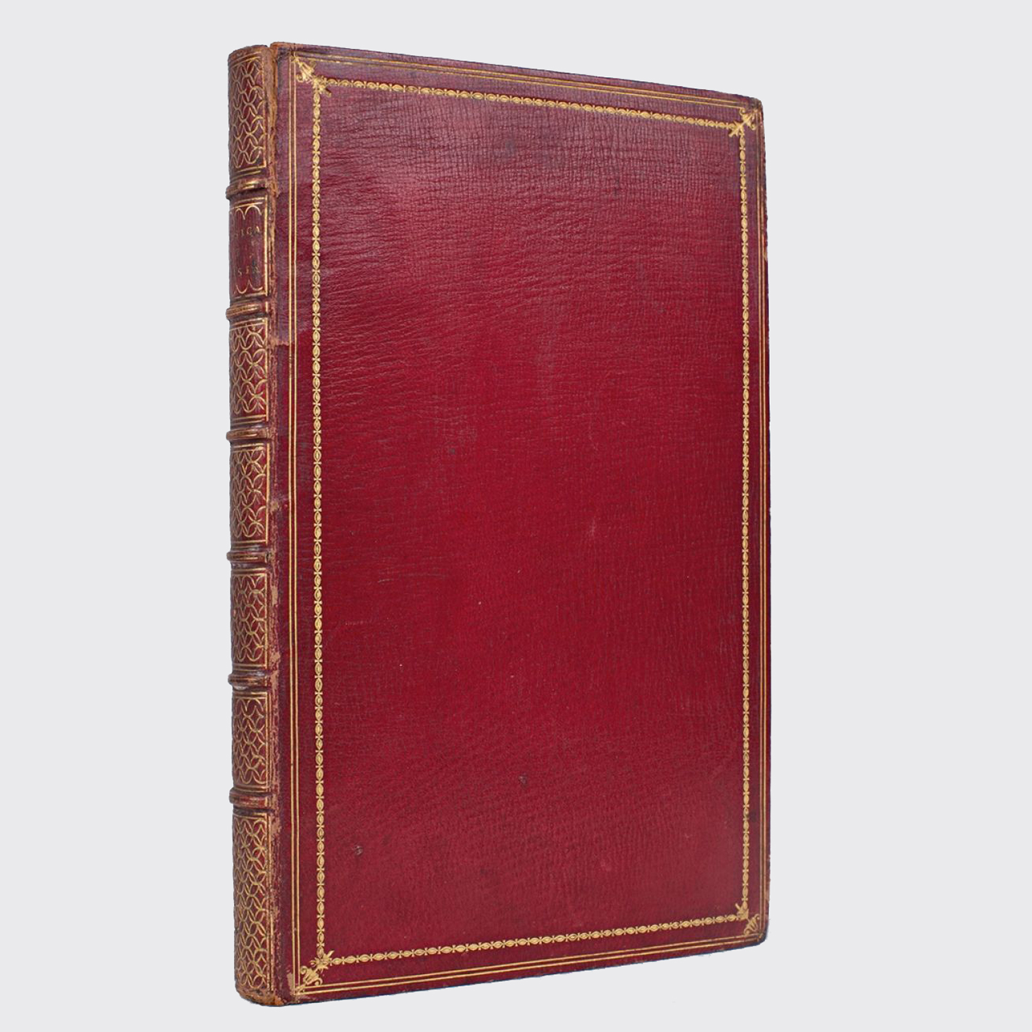 Reliure de l'époque en plein maroquin rouge signée Derôme le jeune, dos à cinq nerfs richement orné à la grotesque de cercles et losanges dorés, doubles filets et roulettes dorées en encadrement des plats, double filet doré soulignant les coupes, fine dentelle dorée en encadrement des contreplats de papier à la colle, toutes tranches dorées.