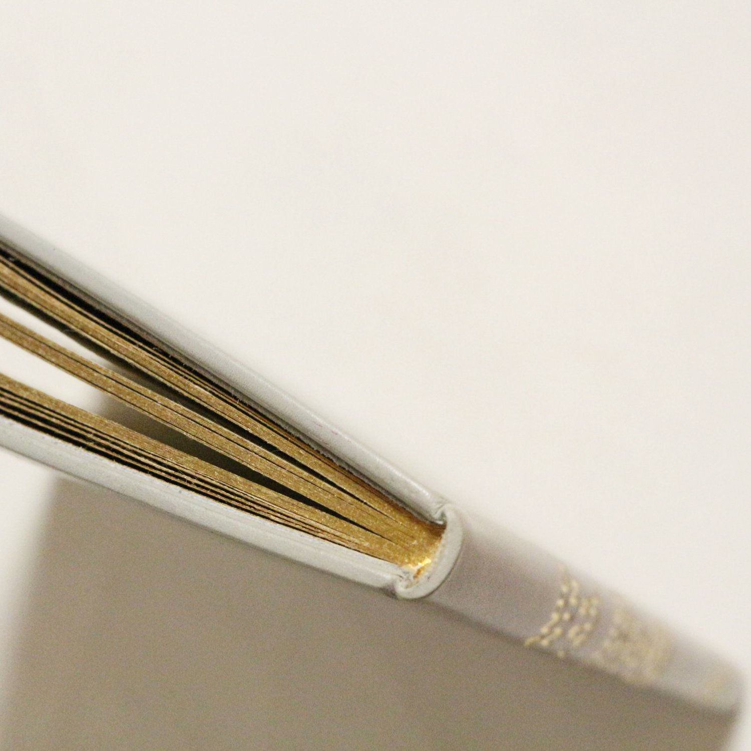 Reliure en plein box gris, dos lisse, titre et noms de l'auteur et de l'illustrateur frappés à l'or sur le dos, plats ornés d'un décor abstrait et géométrique de filets dorés et noirs, gardes et contreplats de box gris souris, couvertures et dos conservés, tête dorée, chemise en demi box gris souris, plats de papier marbré, étui bordé de box gris souris, plats de papier marbré, reliure de l'époque signée Desmules.