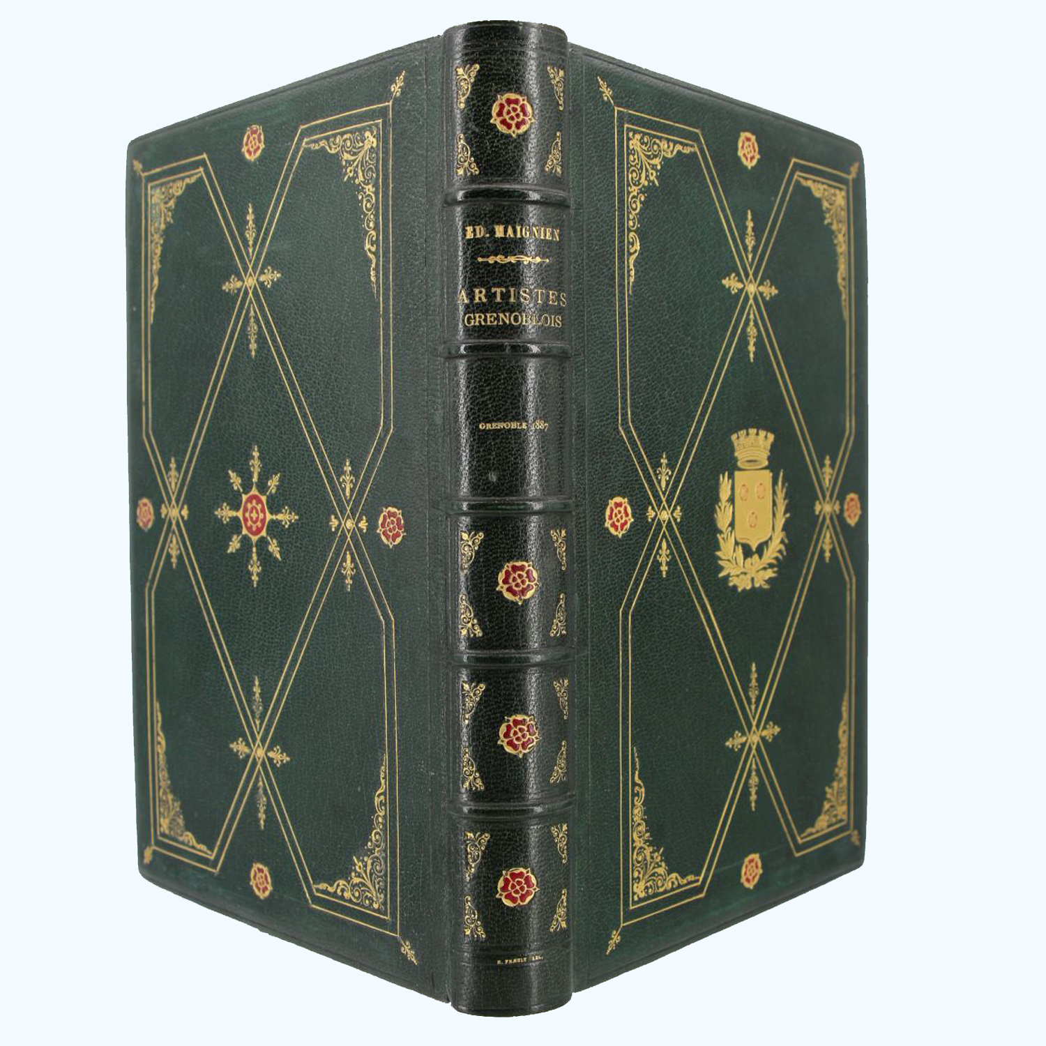 Reliure en plein maroquin vert, dos à cinq nerfs ornés de caissons noirs décorés de motifs typographiques dorés et de pièces de maroquin mosaïqué rouge représentant les roses des armoiries de la ville de Grenoble, roulettes dorées sur les coiffes, premier plat frappé en son centre des armoiries de la ville de Grenoble, plats décorés d'entrelacs dorés et de pièces de maroquin mosaïqué rouge représentant les roses des armoiries de la ville de Grenoble, gardes et contreplats de papier dorée, encadrement d'une dentelle dorée sur les contreplats, couvertures conservées, tête dorée, filets dorés sur les coupes, magnifique reliure frappée aux armes de la ville de Grenoble signée E. Frauly, relieur grenoblois, étui en plein papier marbré, intérieur de papier peigné.