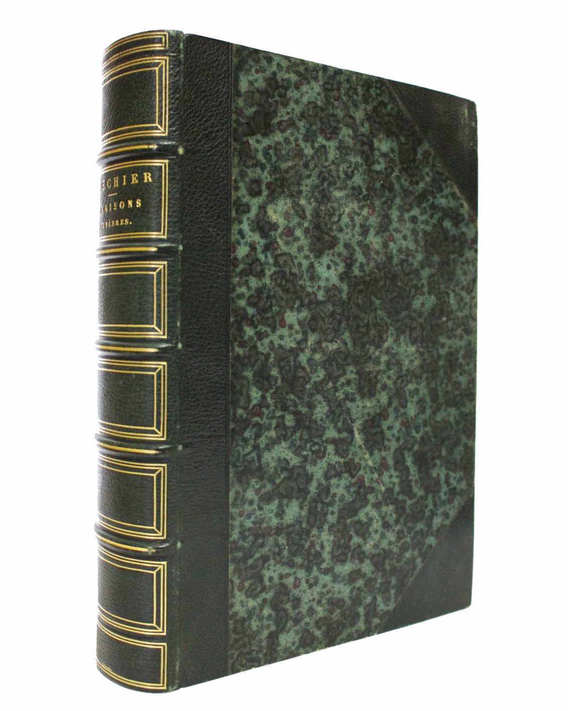 Reliure en demi maroquin vert sapin à coins signée Niedrée en queue. Dos à nerfs orné à la grotesque de vaguelettes stylisées. Têtes dorées. Mince fente au mors supérieur en tête du tome 1 et en queue du tome 3. 2 coins au tome 3 légèrement ouverts et enfoncés. Quelques rares brunissures en marge de certains feuillets. Bel exemplaire, non rogné.