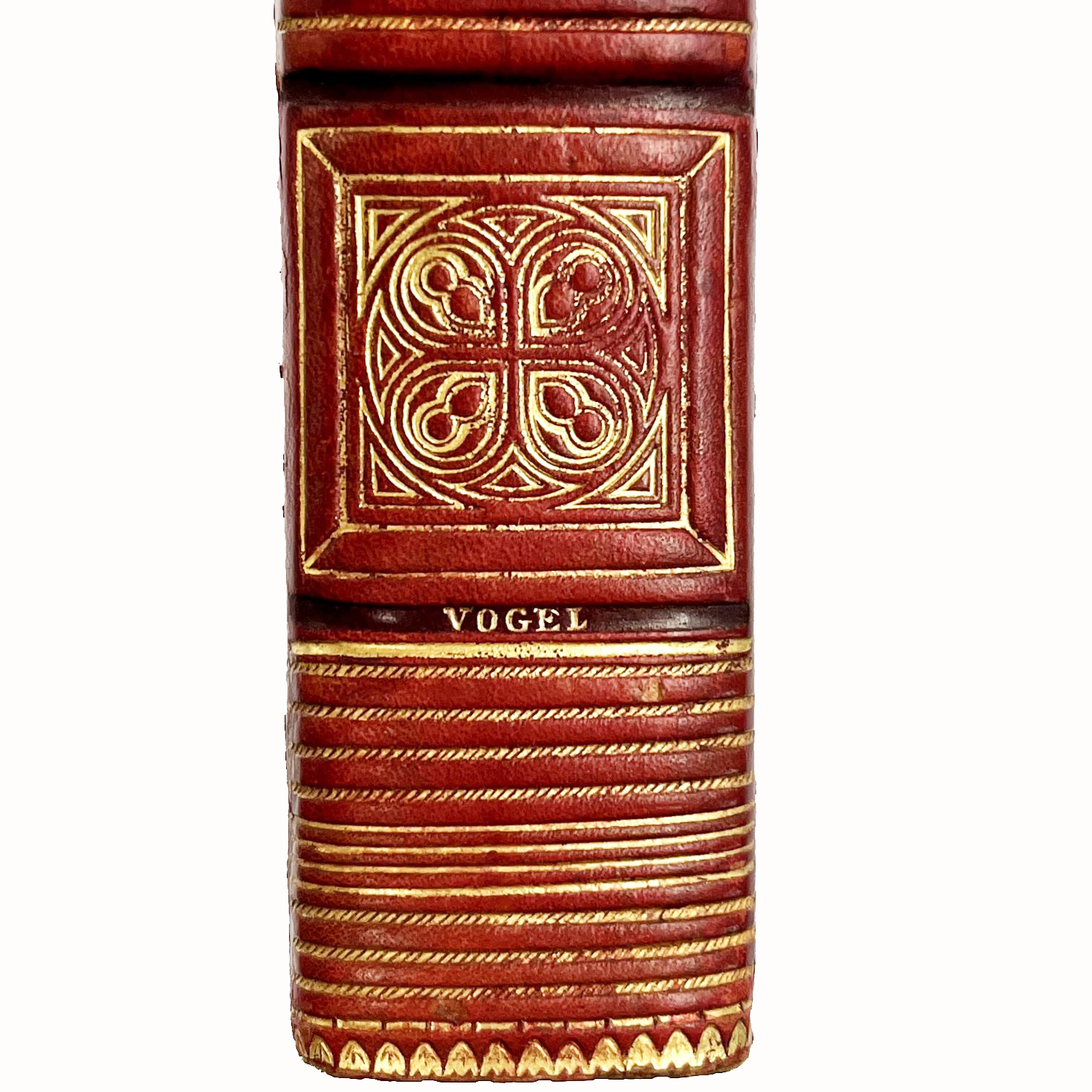 Reliure en plein veau glacé framboise d'époque signée Vogel en queue (un des très grands relieurs de la période Romantique). Dos à nerfs orné de 4 fers monastiques caissonnés, mutiples filets en queue et tête. Pièce de titre de veau glacé grise. Grand ornement central sur les plats, frises d'encadrement à froid et à chaud. Frise intérieure. Tranches dorées. Quelques piqûres. Léger accroc au mors supérieur en tête avec manque.