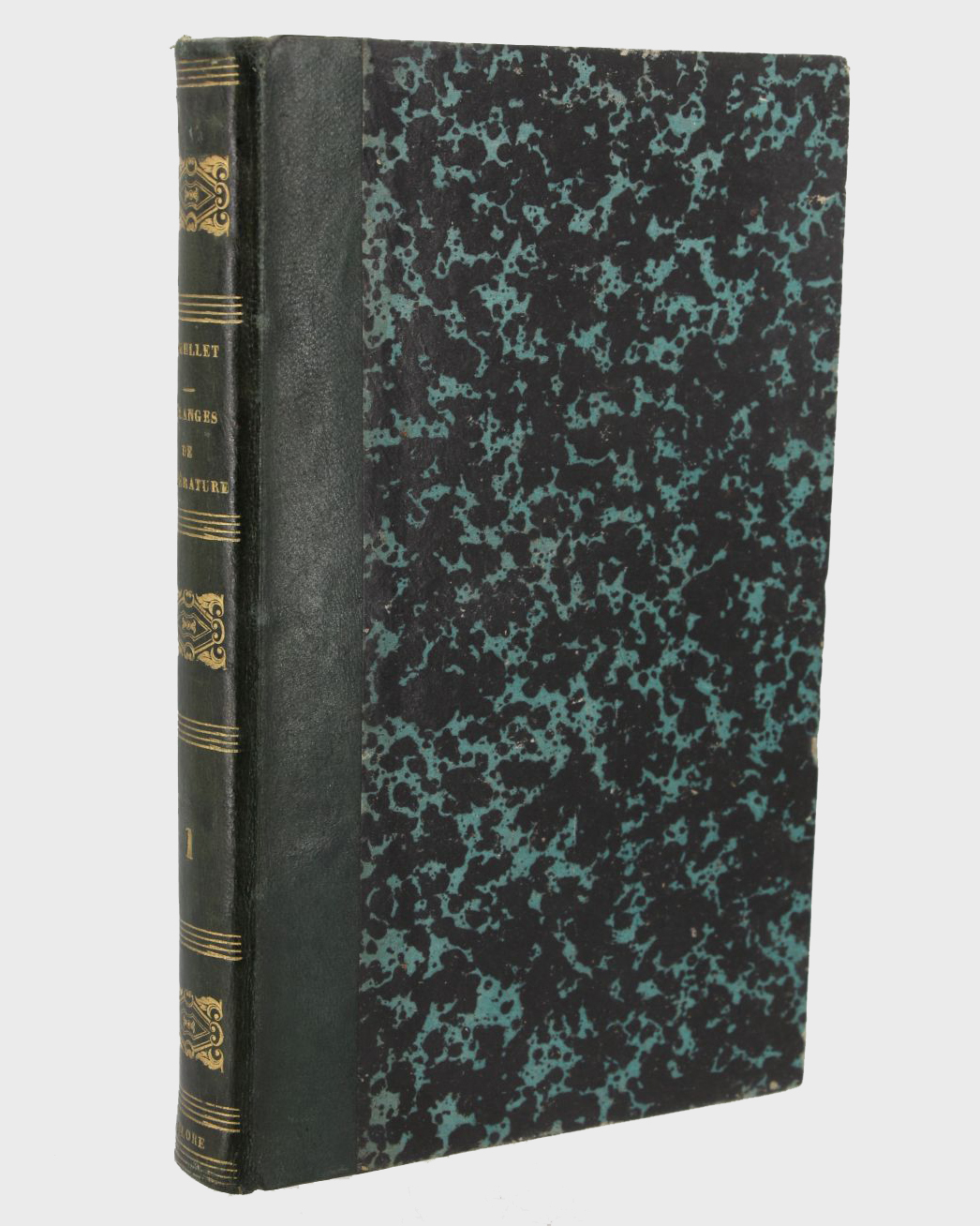 Reliures en demi basane vert bouteille, dos lisses ornés de quadruples filets et de motifs typographiques dorés, deux coiffes supérieures légèrement élimées, plats de papier marbré, gardes et contreplats de papier à la cuve, quelques coins très légèrement émoussés, reliures de l'époque signées de Flore.
