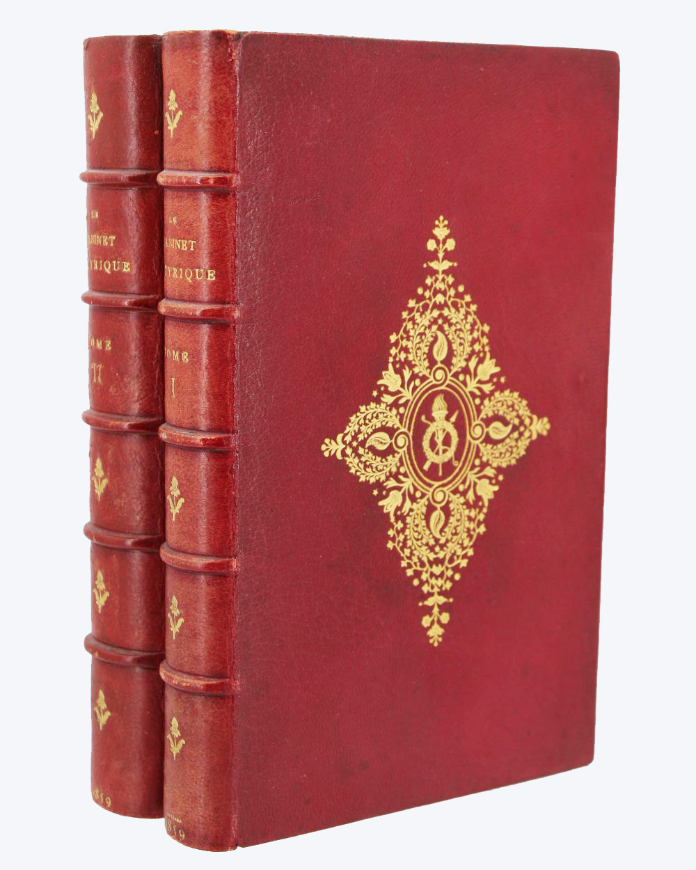 Reliures en plein maroquin rouge, dos légèrement éclaircis à cinq nerfs ornés de motifs floraux dorés, dates dorées en queues, roulettes dorées sur les coiffes, plats frappés en leurs centres d'un jeu d'arabesques dorées composant une mandorle au centre de laquelle figure une allégorie dorée, gardes et contreplats de papier à la cuve, encadrement d'une dentelle dorée sur les contreplats, doubles filets sur les coupes, infimes accrocs sans aucune gravité sur les coupes, toutes tranches dorées, superbes reliures légèrement postérieures signées de Gaillard en queue du dos du premier volume.