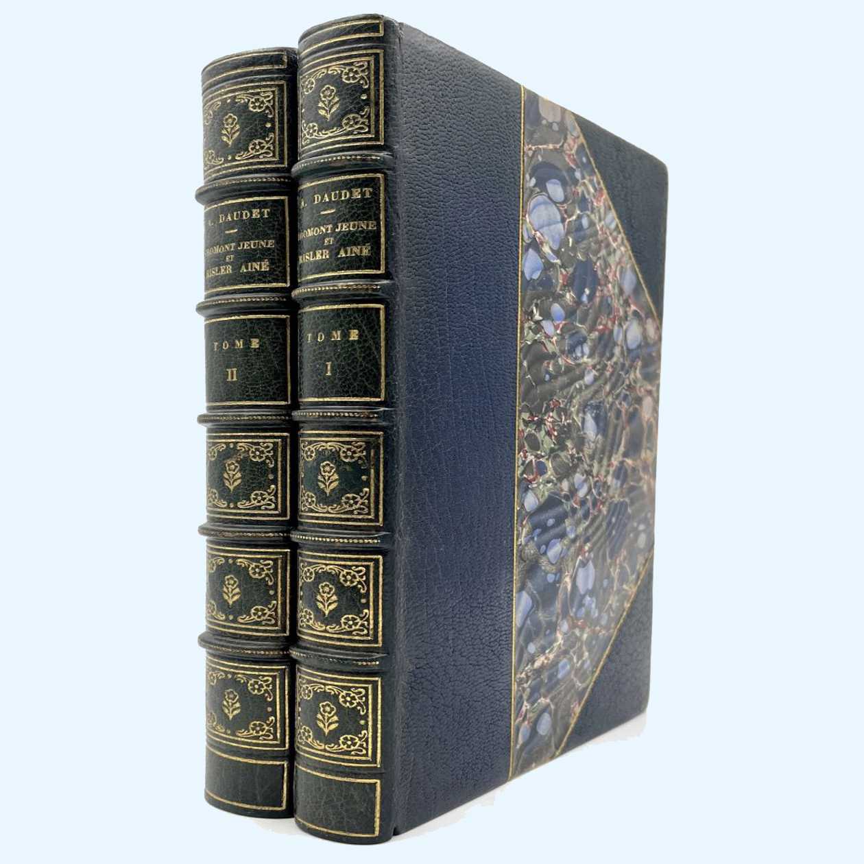 Reliure en demi maroquin à coins marine d'époque signée Grouillet en haut de la première page de garde. Traces légères de frottement (dos, mors, coins, bordures). Dos ayant viré uniformément au vert. Tête dorée. Couvertures et dos conservés. Exemplaire non rogné, à toutes marges. Papier parfaitement frais.