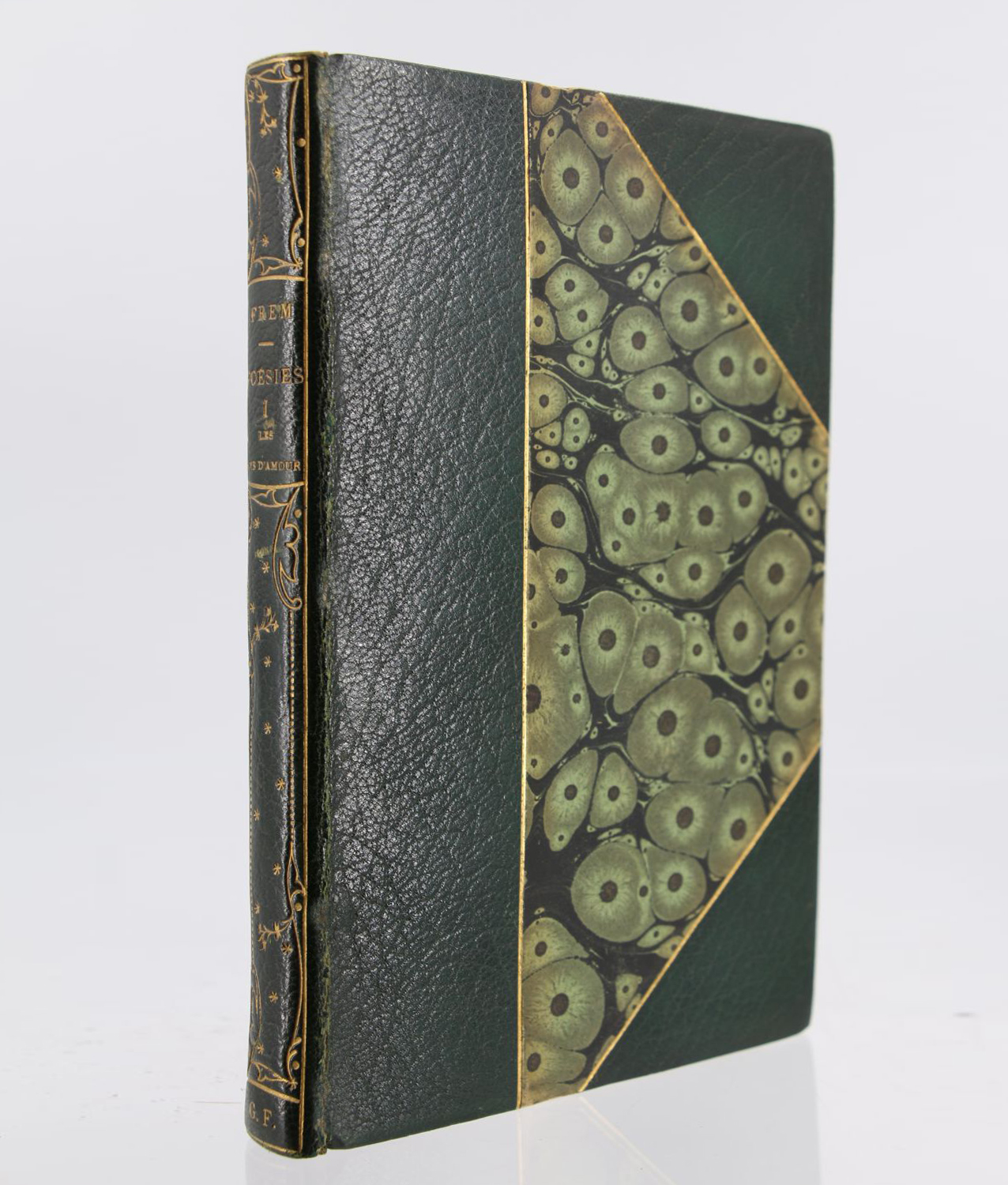 Reliure à la bradel en pleine percaline rouge, dos lisse orné d'un motif floral doré, date et double filet dorés en queue, pièce de titre de chagrin noir, reliure de l'époque signée à froid de Pierson.