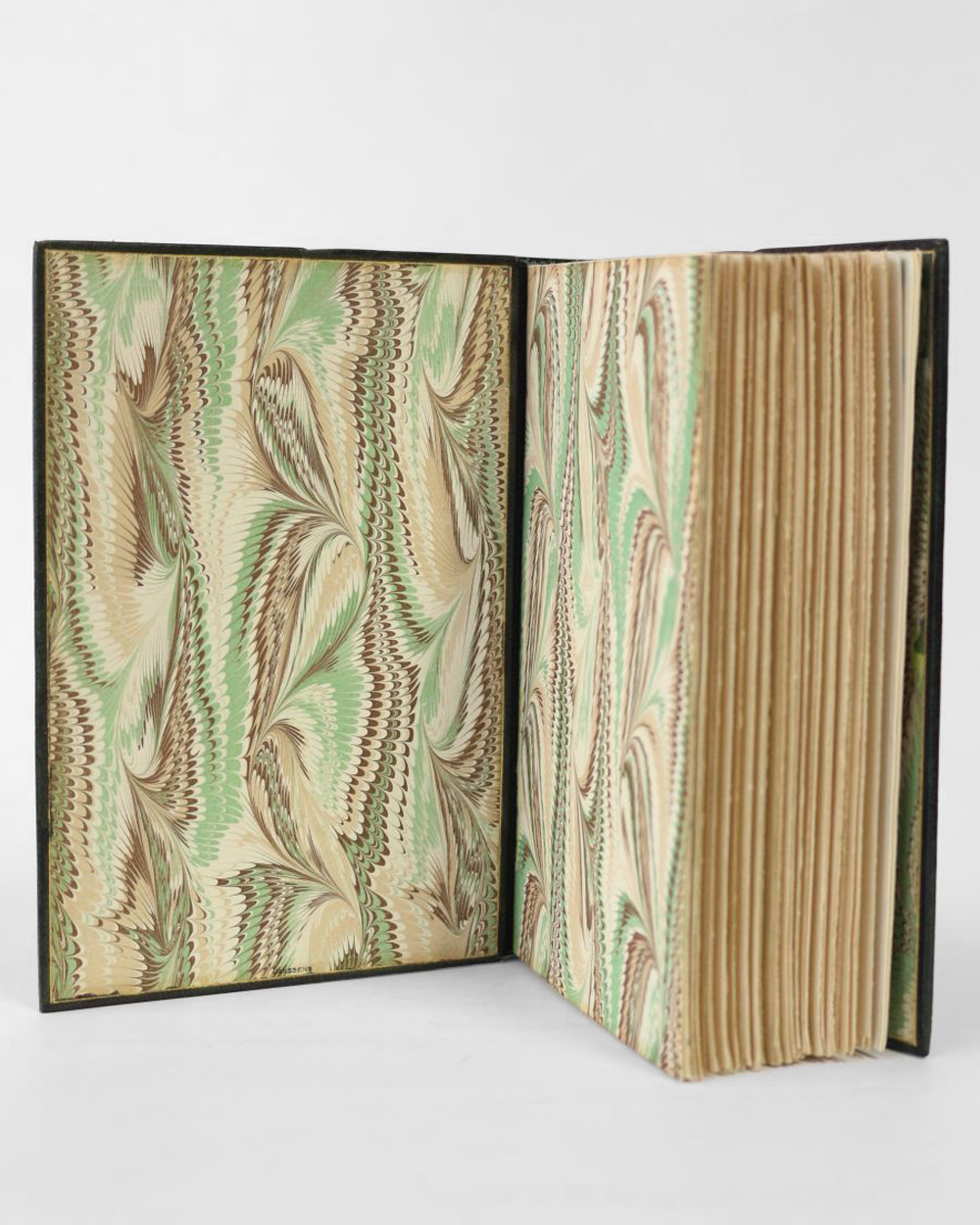 Reliure reteintée en plein maroquin vert, dos janséniste à cinq nerfs, date dorée en queue, gardes et contreplats de papier peigné, couvertures conservées, tête dorée sur témoins, reliure signée Janssens.
