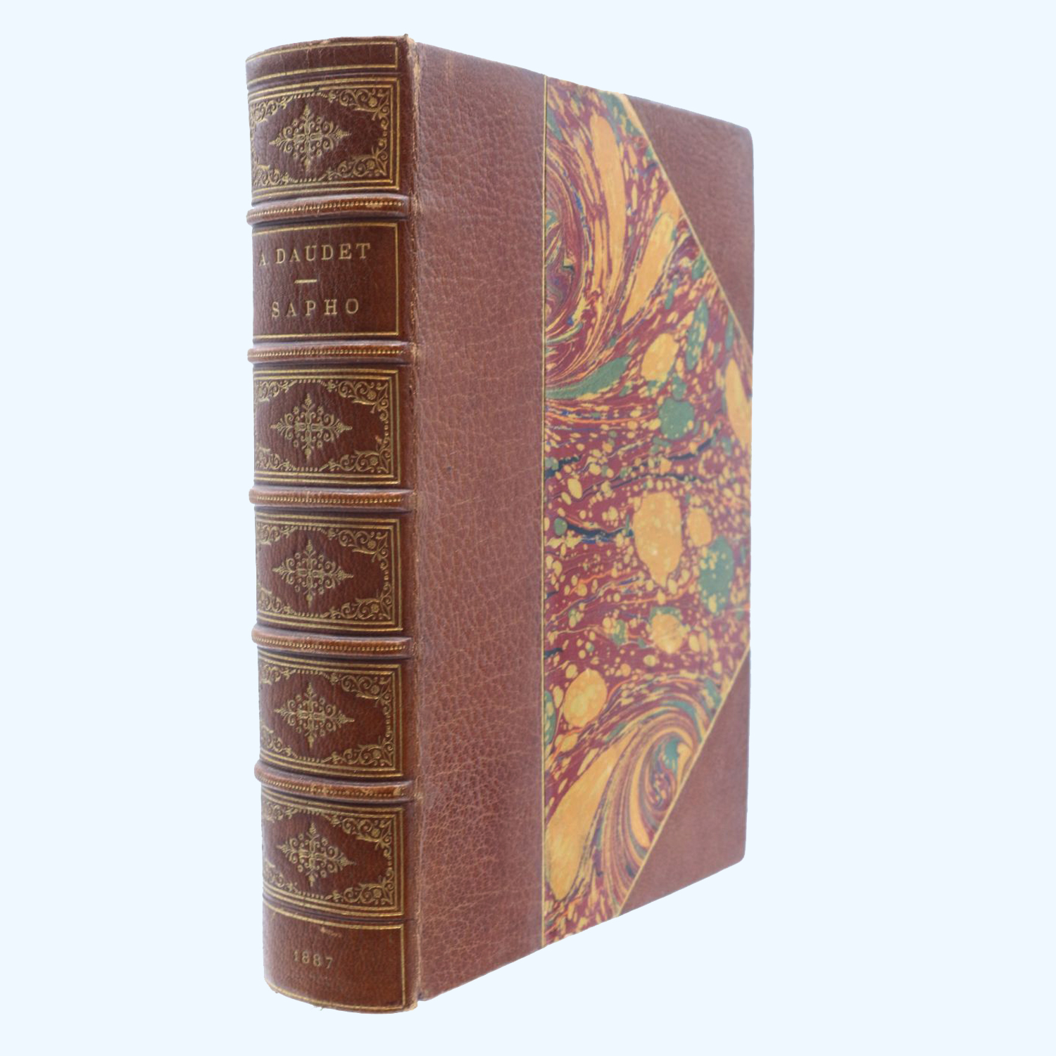 Reliure en demi maroquin fauve à coins, dos à cinq nerfs sertis de pointillés dorés orné de doubles caissons dorés agrémentés de motifs typographiques dorés, date dorée en queue, filet doré sur les plats de papier caillouté, gardes et contreplats de papier peigné, tête dorée sur témoins, couvertures et dos conservés, reliure de l'époque signée Kraft.
