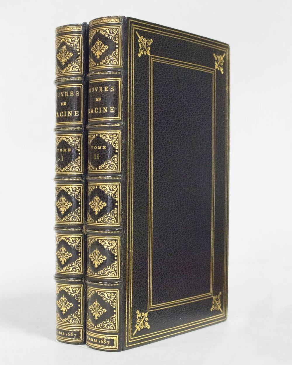 Reliure en demi chagrin chocolat glacé ca 1860 à coins signée L. Fixon en bas du dernier feuillet. Dos à nerfs janséniste. Titre gravé, ainsi que les initiales S. D. Accrocs avec manques sur le plat inférieur. Estafilade à un coin du plat inférieur et coin émoussé. Quelques frottements. Bel exemplaire, bien frais.
