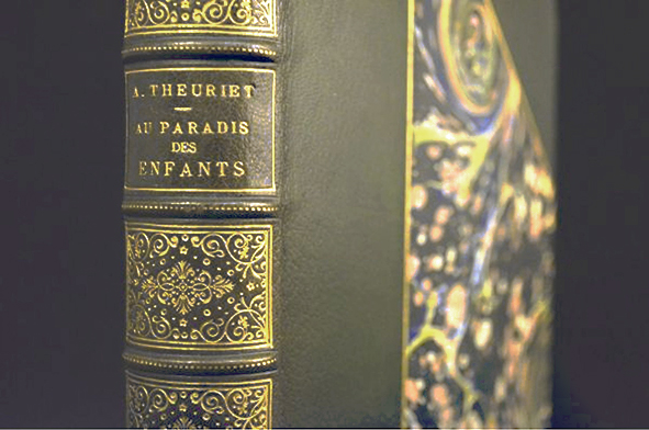 Reliure à la bradel en demi percaline pervenche, dos lisse orné d'un motif floral doré, double filet doré en queue, pièce de titre de chagrin rouge comportant quelques petites traces de frottements, plats de papier marbré, tête dorée, reliure de l'époque non signée mais attribuable à Lancelin.