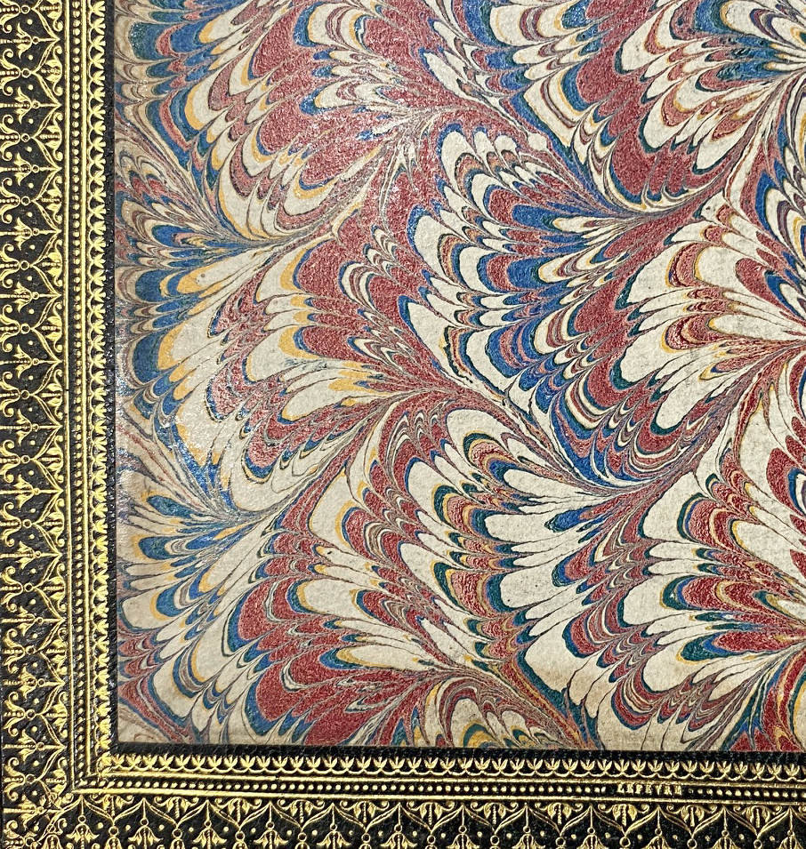 Reliure en plein maroquin vert sapin, dos à cinqs nerfs sertis de filets noirs orné de doubles caissons noirs, roulettes dorées sur les coiffes, encadrement d'un double filet noir sur les plats, une petite tache de décoloration sur le premier plat, gardes et contreplats de papier à la cuve, encadrement d'une dentelle dorée sur les contreplats, filet doré sur les coupes, toutes tranches dorées, élégante reliure de l'époque signée de Lefèvre.