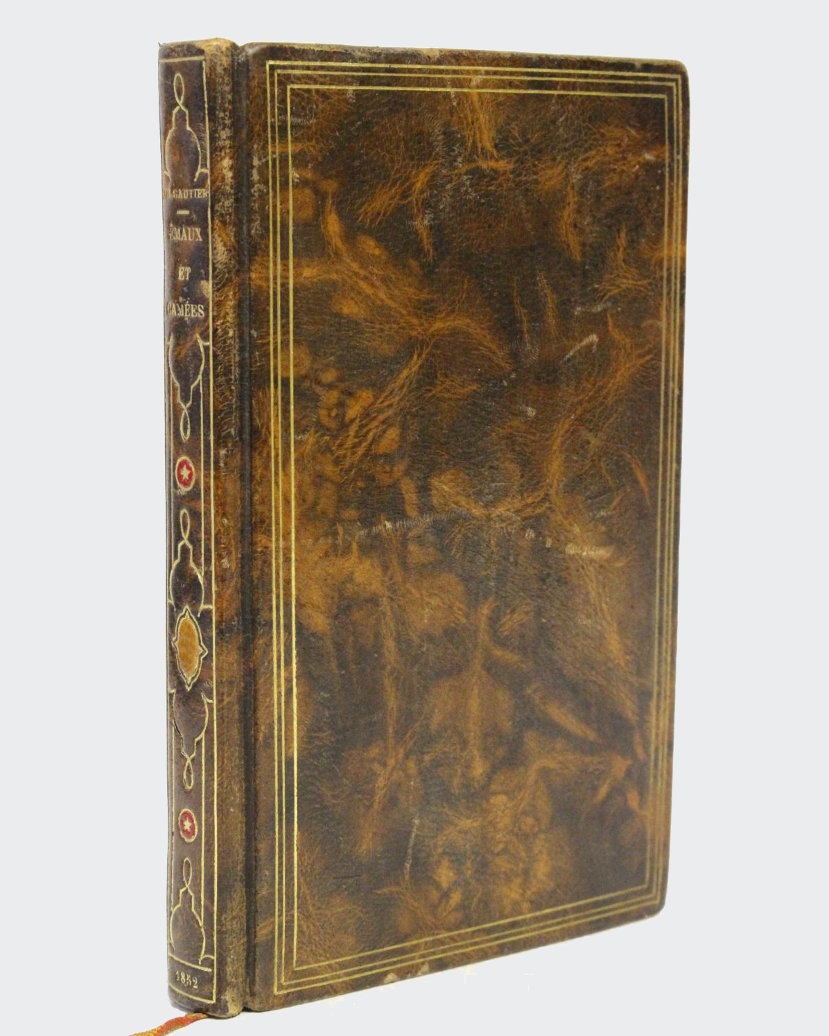 Reliure en demi chagrin bordeaux à coins, dos lisse orné d'un cartouche doré agrémenté d'abeilles dorées ainsi que de motifs typographiques noirs, date dorée en queue, traces de frottements sur les mors, encadrement de filets dorés sur les plats de papier marbré, gardes et contreplats de papier à la cuve, trois coins émoussés, couvertures et dos conservés, tête dorée, reliure signée de Loisellier-Le Douarin.
