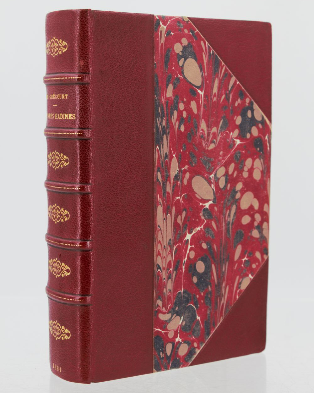 Reliure en demi chagrin maroquiné rouge à coins, dos à cinq nerfs sertis de pointillés dorés et de filets noirs et orné de fleurons dorés, date dorée en queue, plats de papier caillouté, gardes et contreplats de papier peigné, couvertures conservées, tête dorée sur témoins, ex-libris encollé sur un contreplat, reliure signée Mativet.
